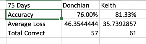 I just ran the numbers on the S&P comparing Keith’s numbers to a 16 day Donchian Channel (3 weeks in trading days), and the numbers are pretty close. Keith’s numbers are better, but definitely not by that much. I’m attaching a screenshot of some of the stats I ran comparing DC to Keith. The closing S&P price fell within Keith’s range 81.33% of the time, and within the Donchian Channel’s range… wait for it… 76% of the time. When Keith was wrong, he was wrong by an average of 35.7 points, and when Donchian was wrong, it was wrong by an average of 46.3 points, so Keith will save you by about 10 points on the S&P give or take.