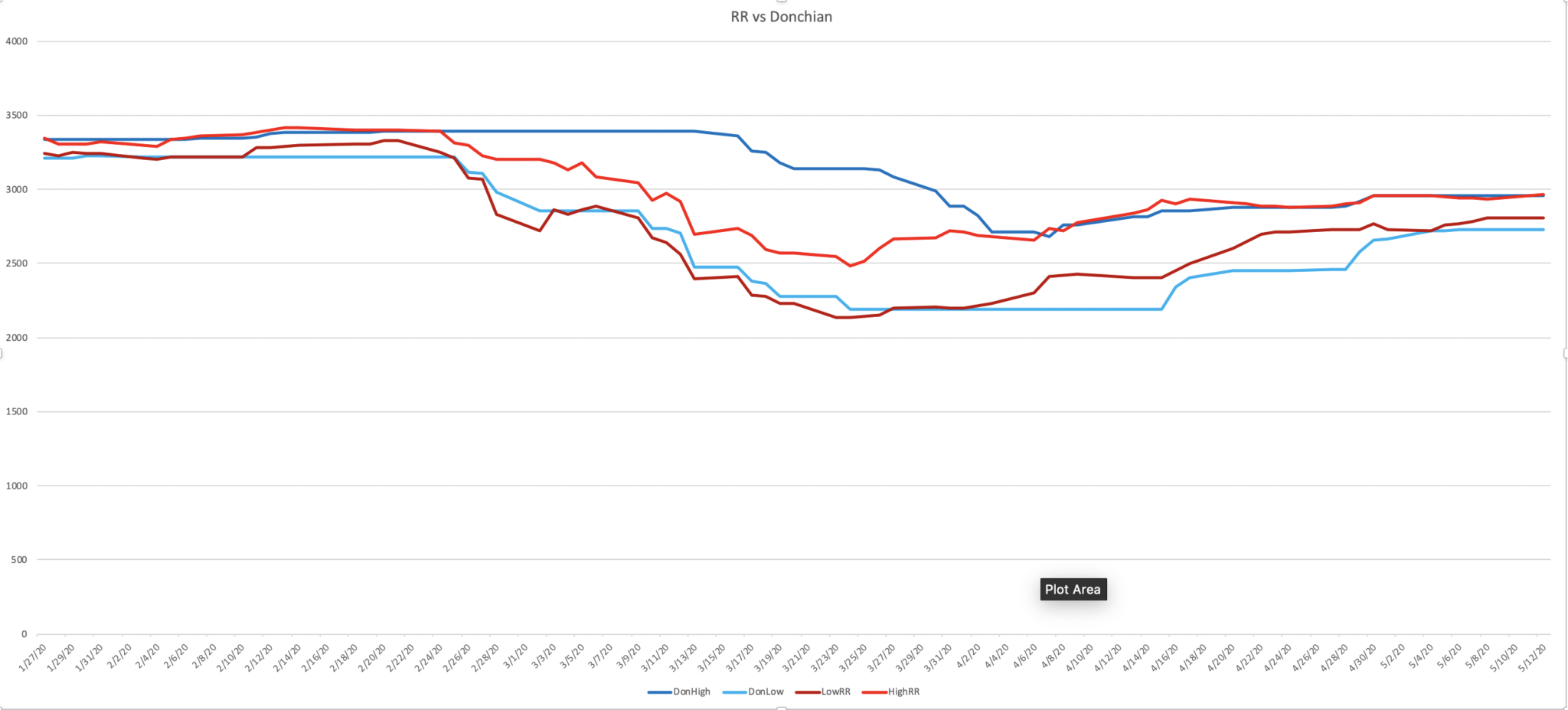 Where Keith’s numbers are superior to DCs is in big moves. Donchian channels can be slow to adjust to big moves up or down. Check out this graph and see how Keith’s numbers adjusted quickly to the market tanking in Feb/March, while the upper range Donchian channel was slow to adjust. I imagine that could be problematic on its own.