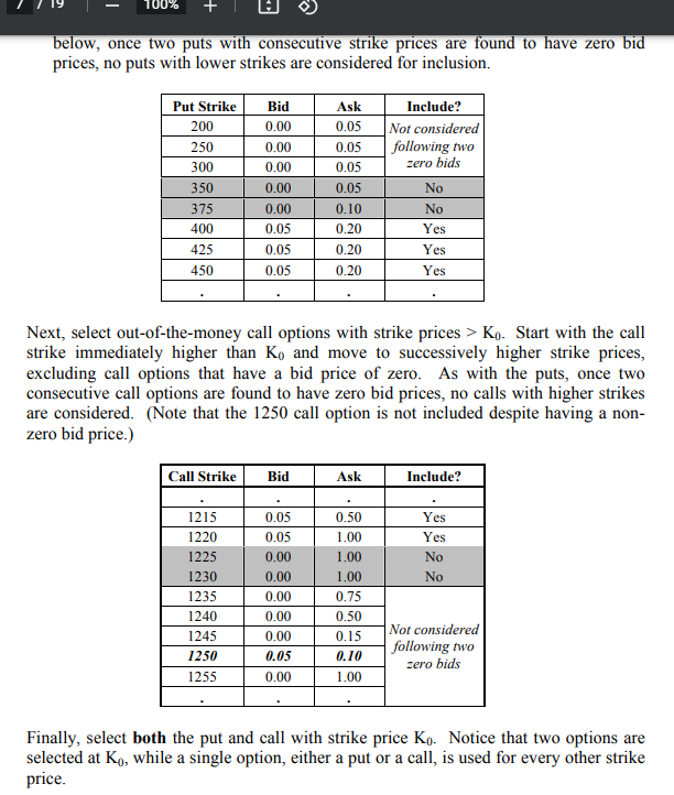2) Starting from that forward level strike price, go up and down the list of strikes until the bid prices start to drop off to zero. Once you hit two strike prices in a row with a zero bid, you stop going any further. (see screenshot for more).