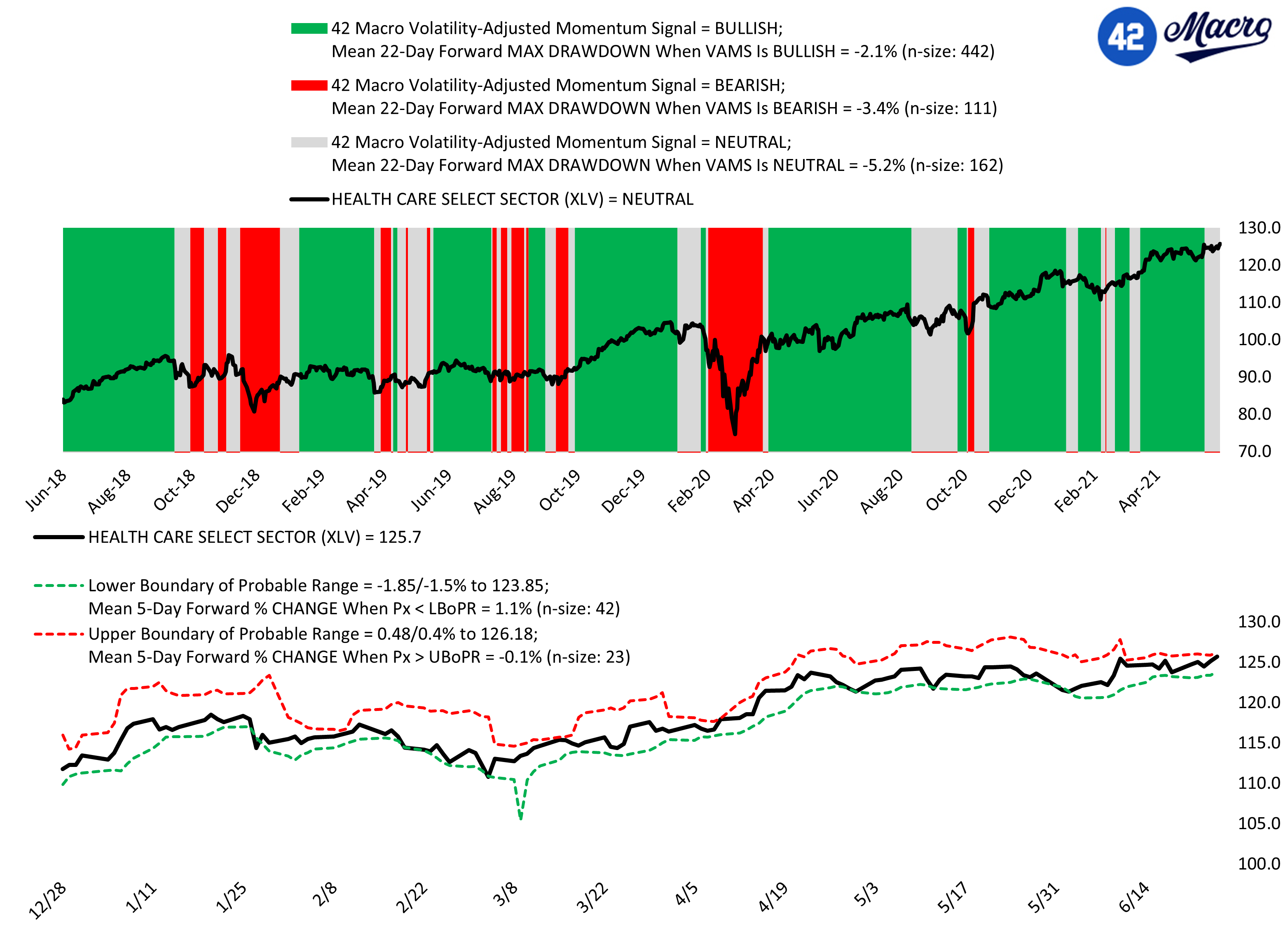 42Macro is essentially renaming them Volatility Adjusted Momentum, ‘Probable Ranges’. In the video Darius explains that the 22 day trend is given +1 point for price trend and +1 point for volatility trending opposite for long, and -1 for down trend and -1 for vola increasing. Where score is not +2 or -2 trend is neutral. Further the probable range bands are derived from ‘rescaled ranges‘. See the excellent pic below!