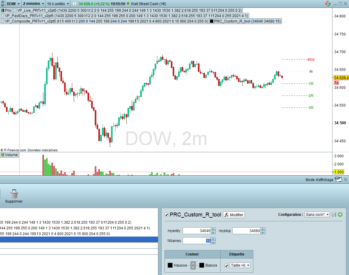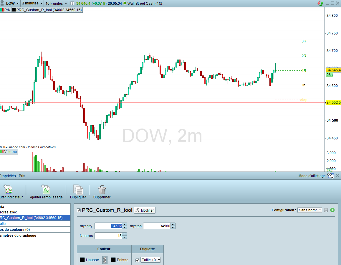 Hi, here’s a probuilder personal indicator to add to the price window, you just need to create the 3 entry parameters myentry, mystop, Nbarres respectively your expected entry level, your expected stop and the number of bars to the right to draw the levels and text. Then you can just change them from the indicator properties window. It works for both long and short, as long as stop is positionned accordingly compared with entry, it will automatically place 1R,2R,3R in the right direction. Any request to modify, please ask I’ll see what more I can do: