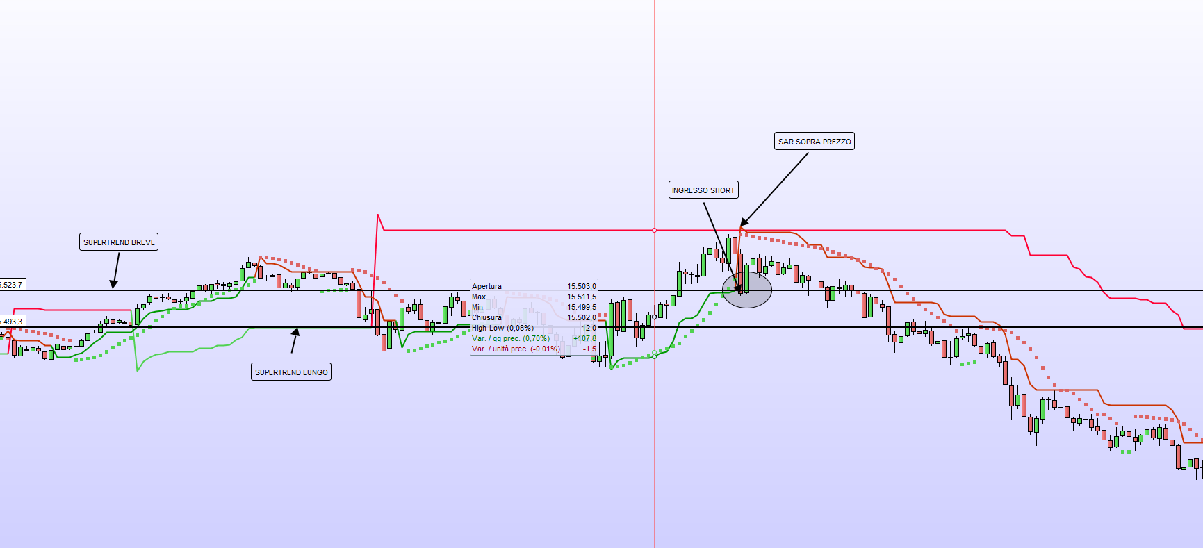 - solo se l’incrocio tra prezzo e supertrend avviene più in basso rispetto all’incrocio tra prezzo e supertrend a lungo