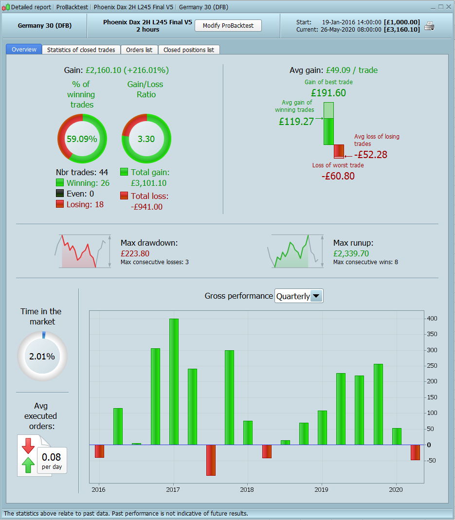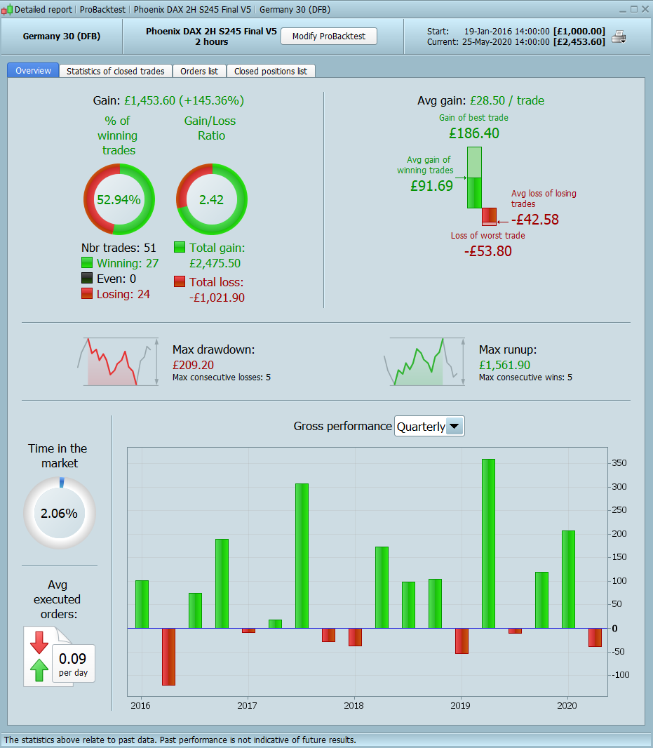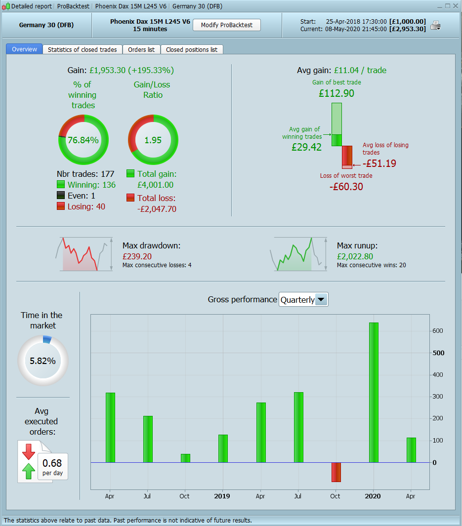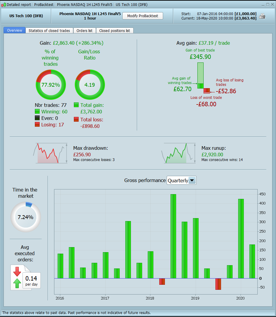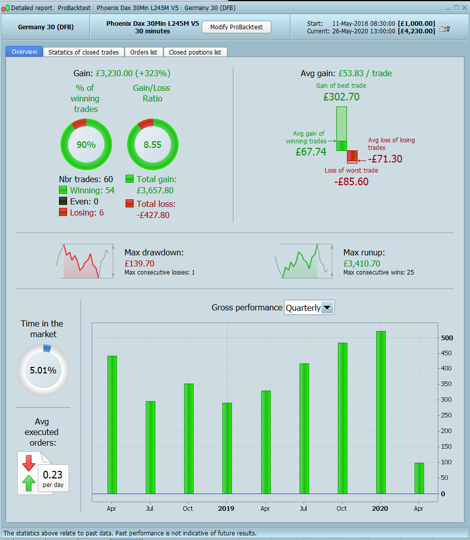 I have restarted the portfolio again at £5k following a review of all the previous codes. Following on from the previous prorealtime codes I have moved onto higher time frames that should offer more reliable signals as such most of the new codes will now trade between one and two times per month.