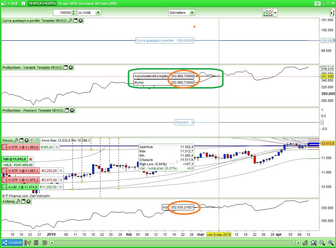 The following test was made on the indicator “Wilder’s Accumulative Swing Index (ASI)” and the same code turned into a strategy with embedded code, though some slight differences show also if I CALL it.
