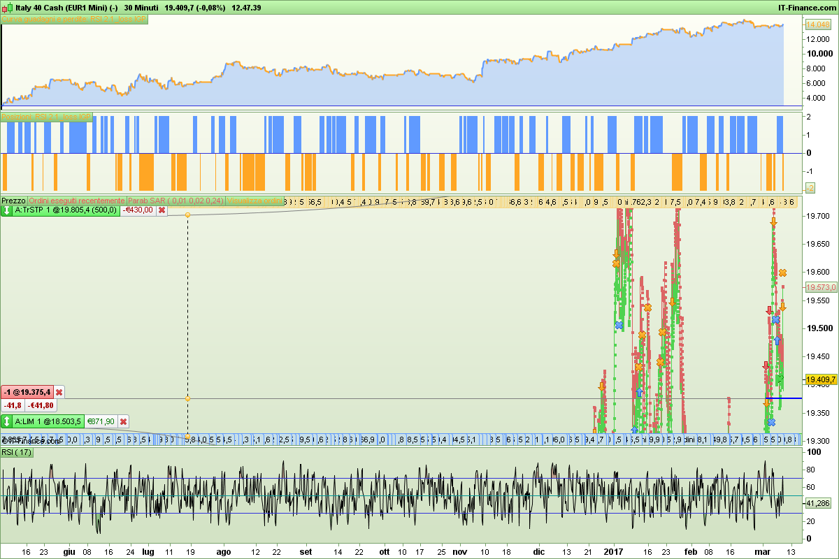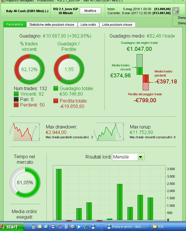The results become from a simulation on a mini contract on Italy market (IG Data). Initial capital = 3,000 €, no slippage (platform on IG is indeed very effective), commission per order = € 25.