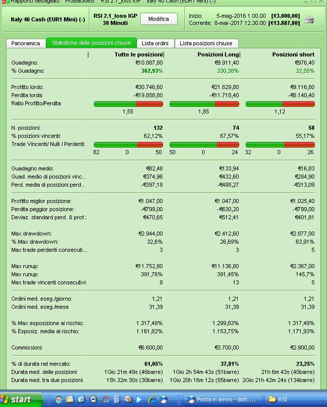 For closing the position, I haven’t inserted a filter based upon the opening market (as for opening) but I’ve preferred a decay of the main indicator (RSI < or > 50) against my position, and this simple choice is revelead effictive.