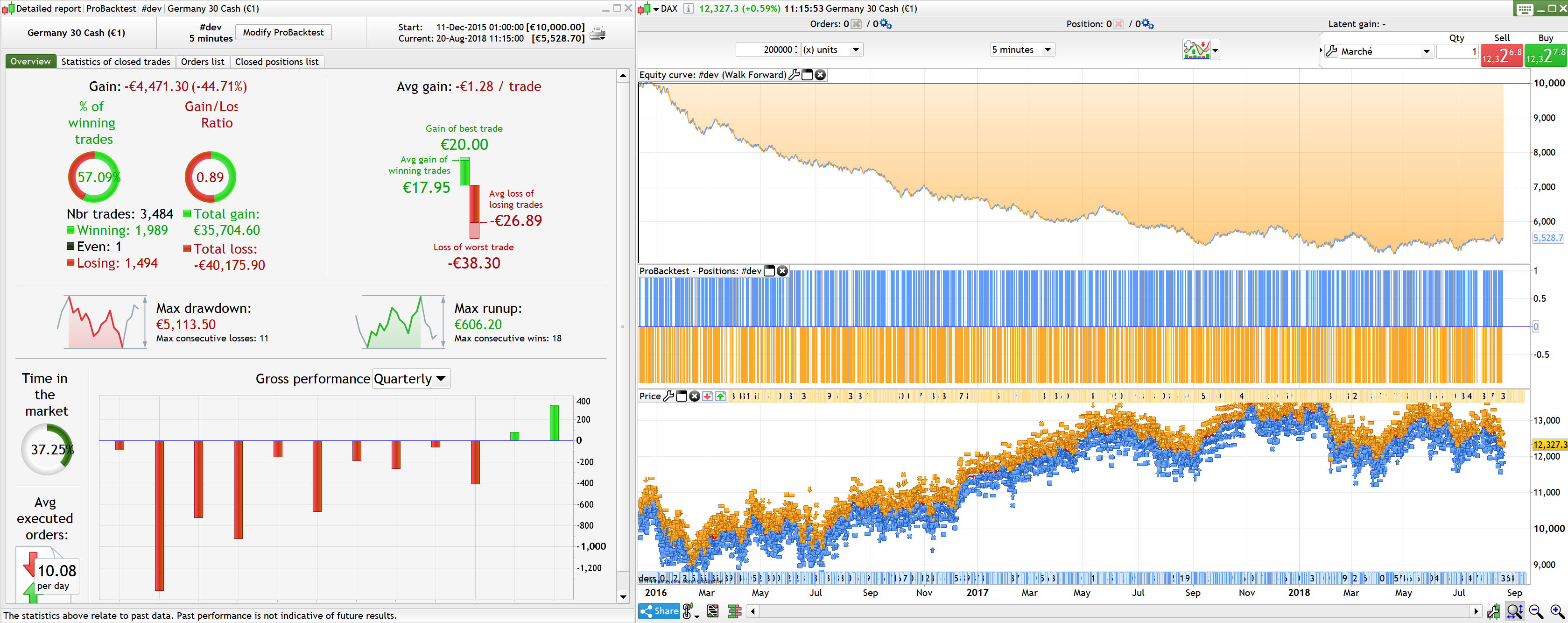 Hola, este es el resultado que obtengo con más de 200k de backtest, en el modo tick a tick y con 1 punto de spread. Es la razón por la que le pregunto sobre la explicación (¿y la zona horaria?) En mi publicación inicial. Como puedes ver por ti mismo, ¡esto es muy diferente! ¿Hiciste la prueba en modo tic y con spread?