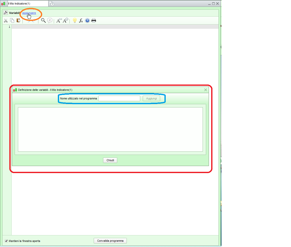 Per aggiungere le variabili vedi l’immagine allegata, clicchi su AGGIUNGERE, poi indichi il nome, quindi ti verrà chiesto il tipo di dato ed il valore di default (che potrai cambiare con le proprietà).