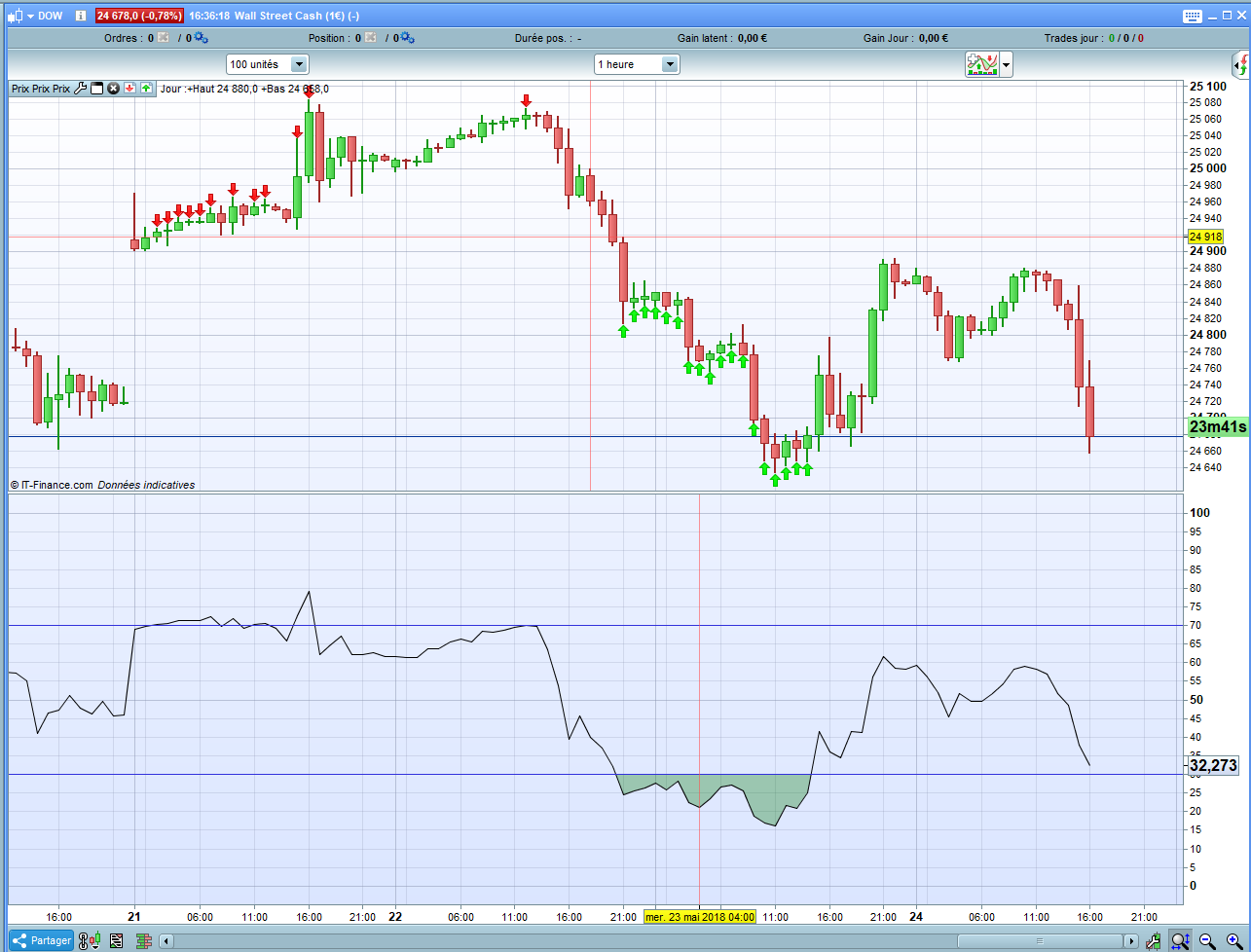 è possibile indicare sul prezzo delle frecce rosse a ribasso se RSI maggiore 70 e frecce verdi al rialzo quando RSI maggiore 30.