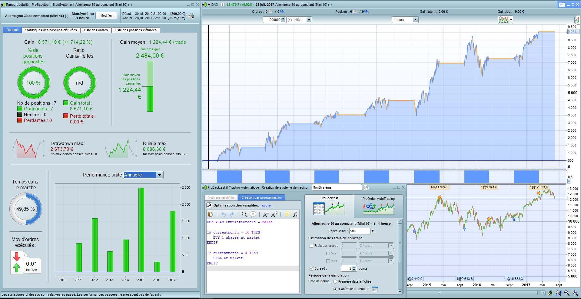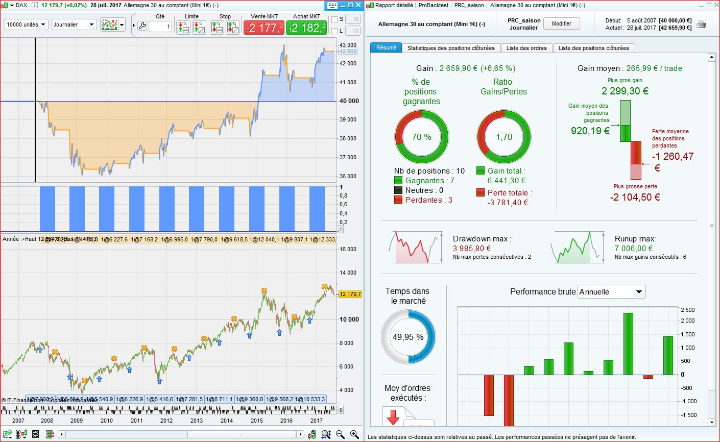 Pourquoi je me permets de le signaler, c’est parce que je me doute que si ce backtest comme d’autres récemment sur le site démarre en 2010, c’est parce que la plateforme propose le tick by tick à partir de cette date et propose cette date de départ par défaut, mais sur cette stratégie de test “achat avril vente octobre” sans stop loss, pas besoin de tick by tick. On peut donc pour ceux qui n’avaient pas l’habitude des longueurs d’historique par défaut “avant” l’introduction du tick by tick sélectionner une date d’historique bien antérieure pour tester la stratégie a minima depuis le top de 2007 ou tant qu’à faire depuis le plus loin possible en arrière selon l’histo dispo par instrument, en cliquant sur le petit calendrier à droite de la date de départ dans la fenêtre de création de backtest.
