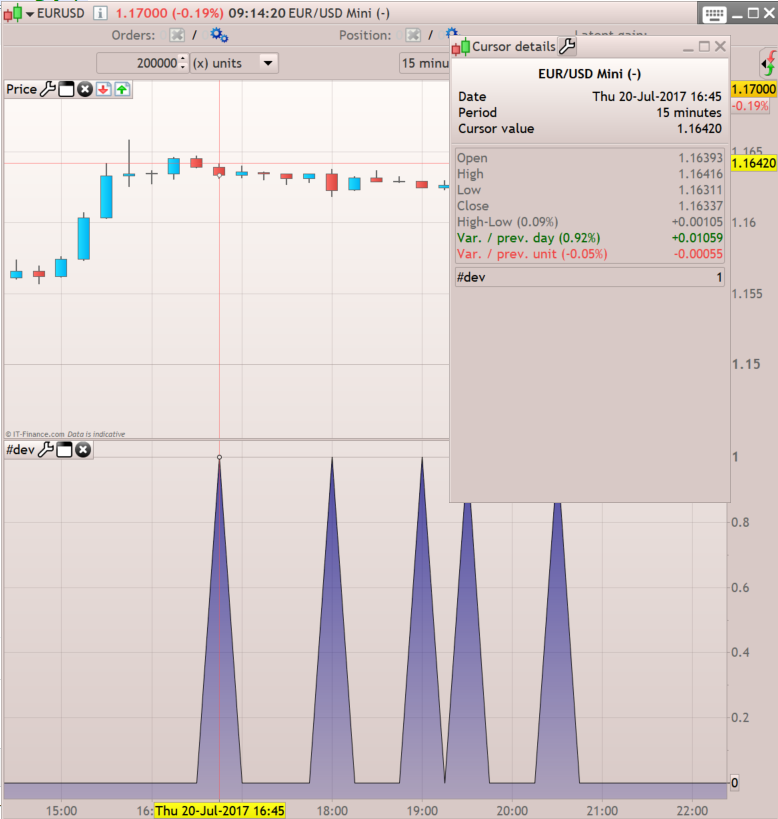 EURUSD mini with [scode] return close <low[1] [/scode] indicator returns the same exact candle than the Spot instrument. Order should be closed here.. don’t know why it doesn’t.