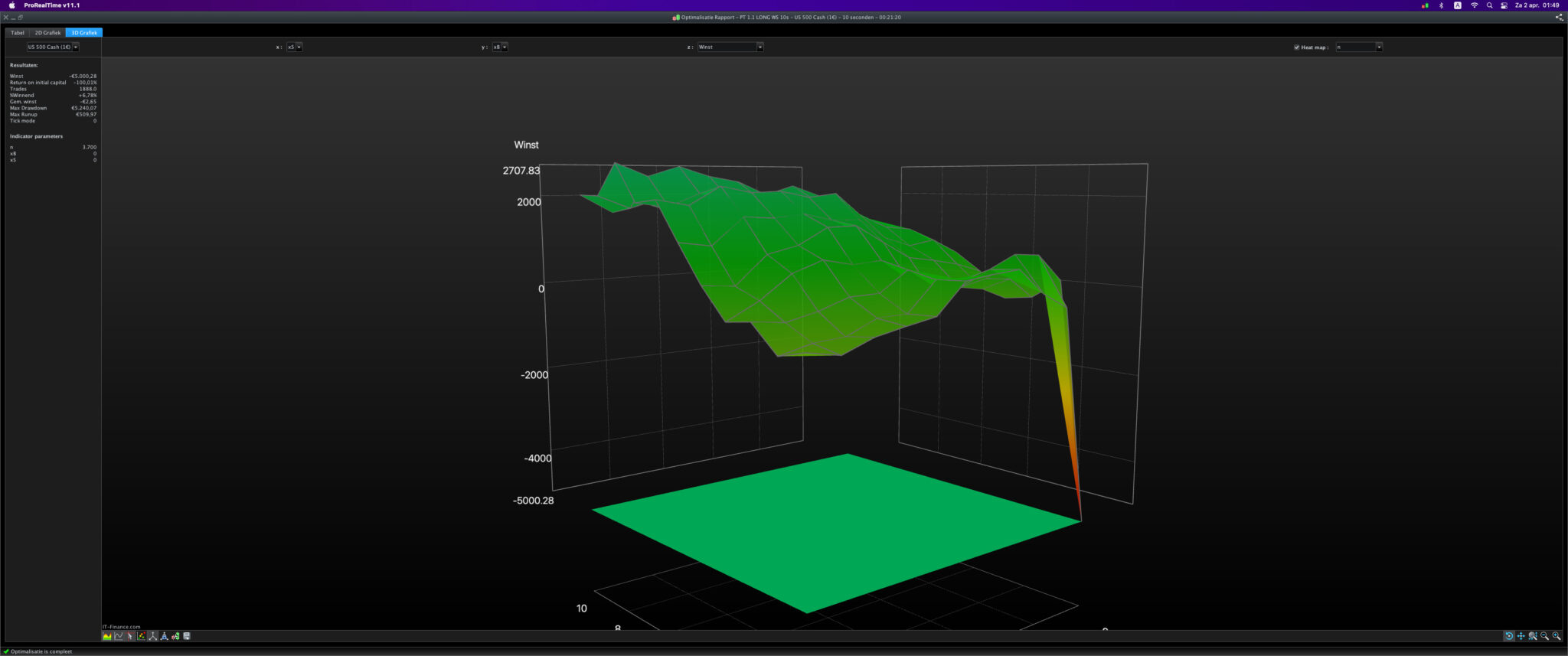In the 3D graph, parameters from the back test are shown on the X and Y axis. The Z-axis shows things like profit, drawdown of runup.
