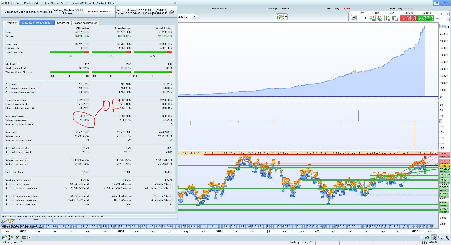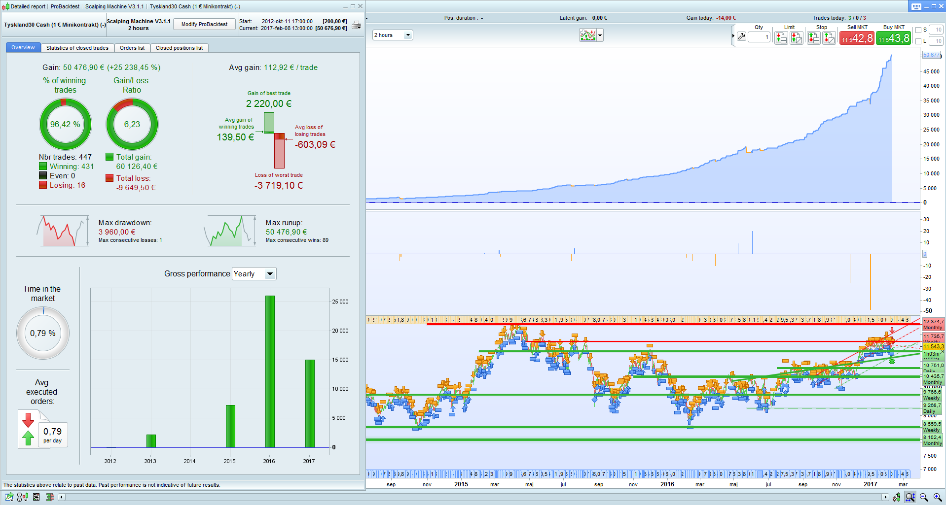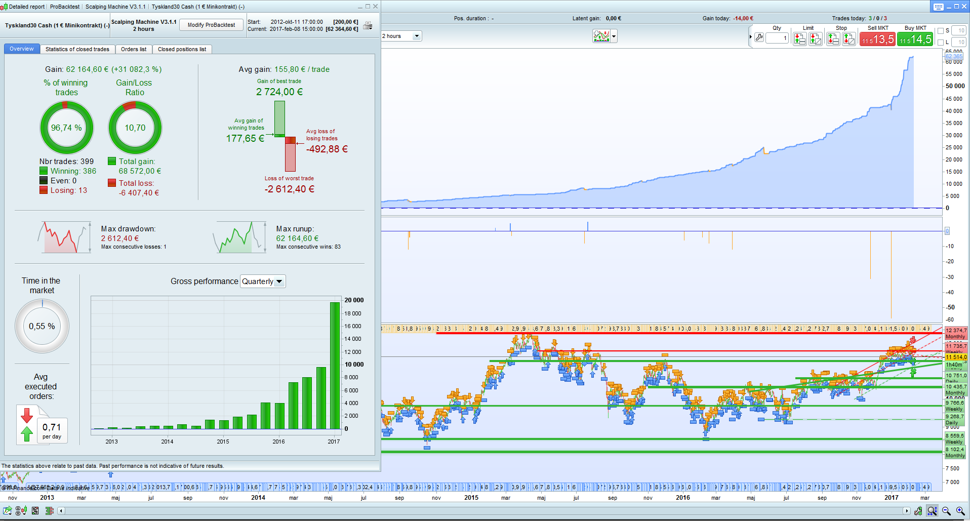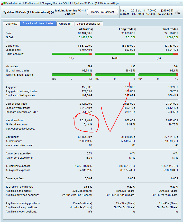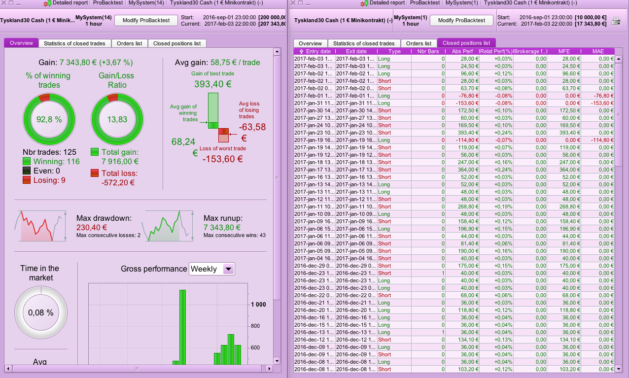 I would like to show you my first attempt to create a system.It is a Scalp system for Timeframe 1 hr Dax ,Take Profit 4 pips and Trailing Stop 12 pips. The System start in 8 30 pm Time Zone GMT+1 and stop 17 00, Spread is 1 point .It has become backtest from 2012 and the results the see above.