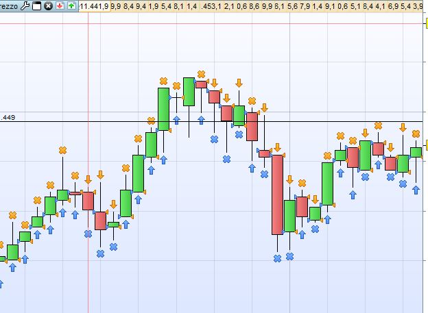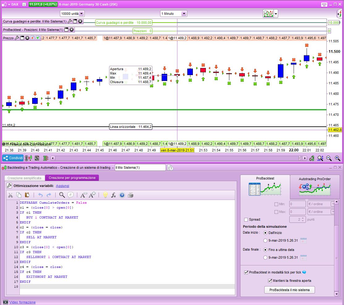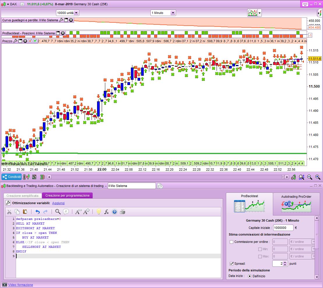 Vorrei partire da qui: se candela verde, allora compra altrimenti vendi e così per ogni candela. Idea di partenza, che poi può essere perfezionata. Quindi per il momento trade chiuso ad ogni candela senza inserire nè stop nè target (poi ovviamente da perfezionare).