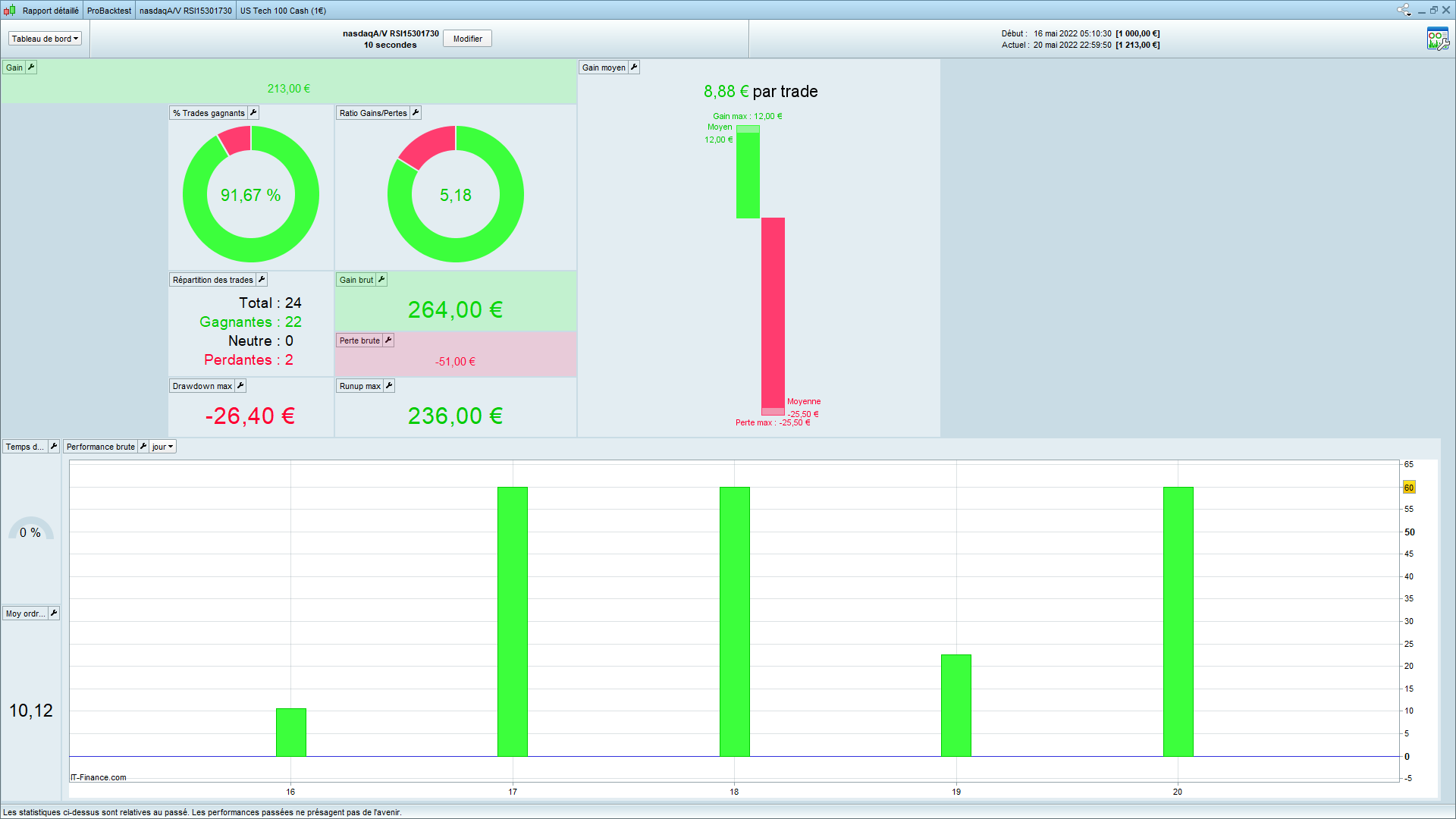 Voici le backtest réglé sur 5 trades en 10 sec avec tp 12 et stop a 28 sur nadasq