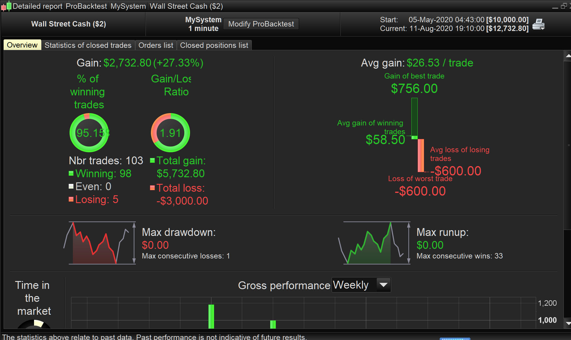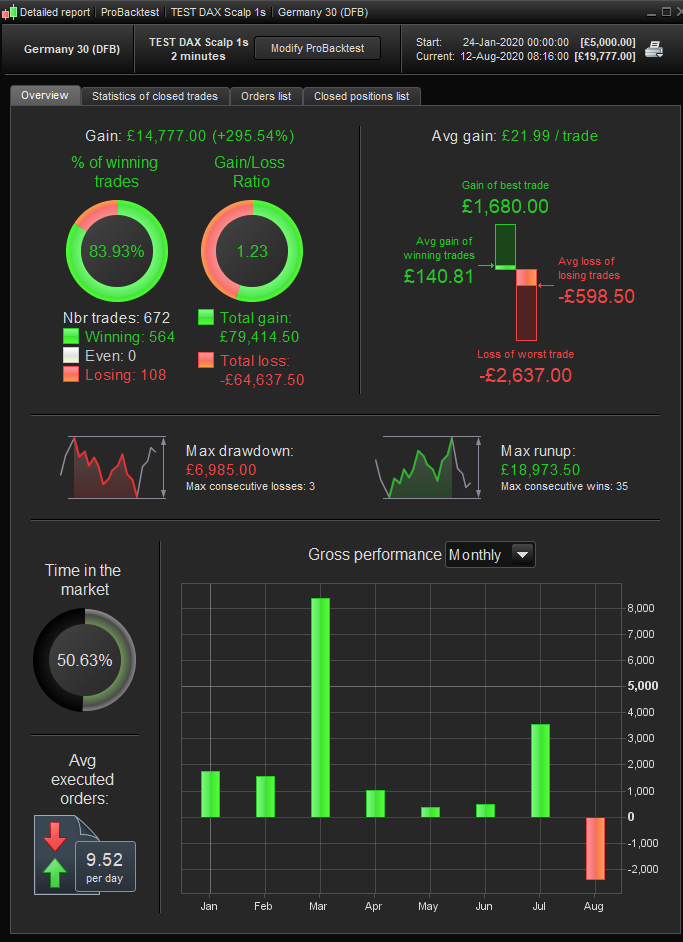 I’m running this on the DAX on a 2 min time frame. Initial Capital of 5,000 and trading 5 per point. I am using a Spread of 2, but may need to increase this as it trades around the clock.