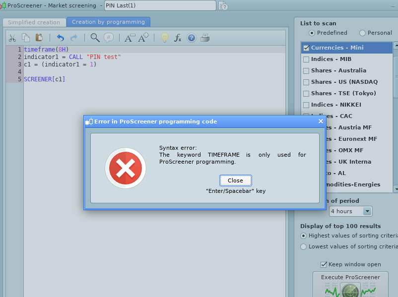 ProScreener only allows standard TF’s. If a TF is not available in its menu, then it is not available in coding, too.