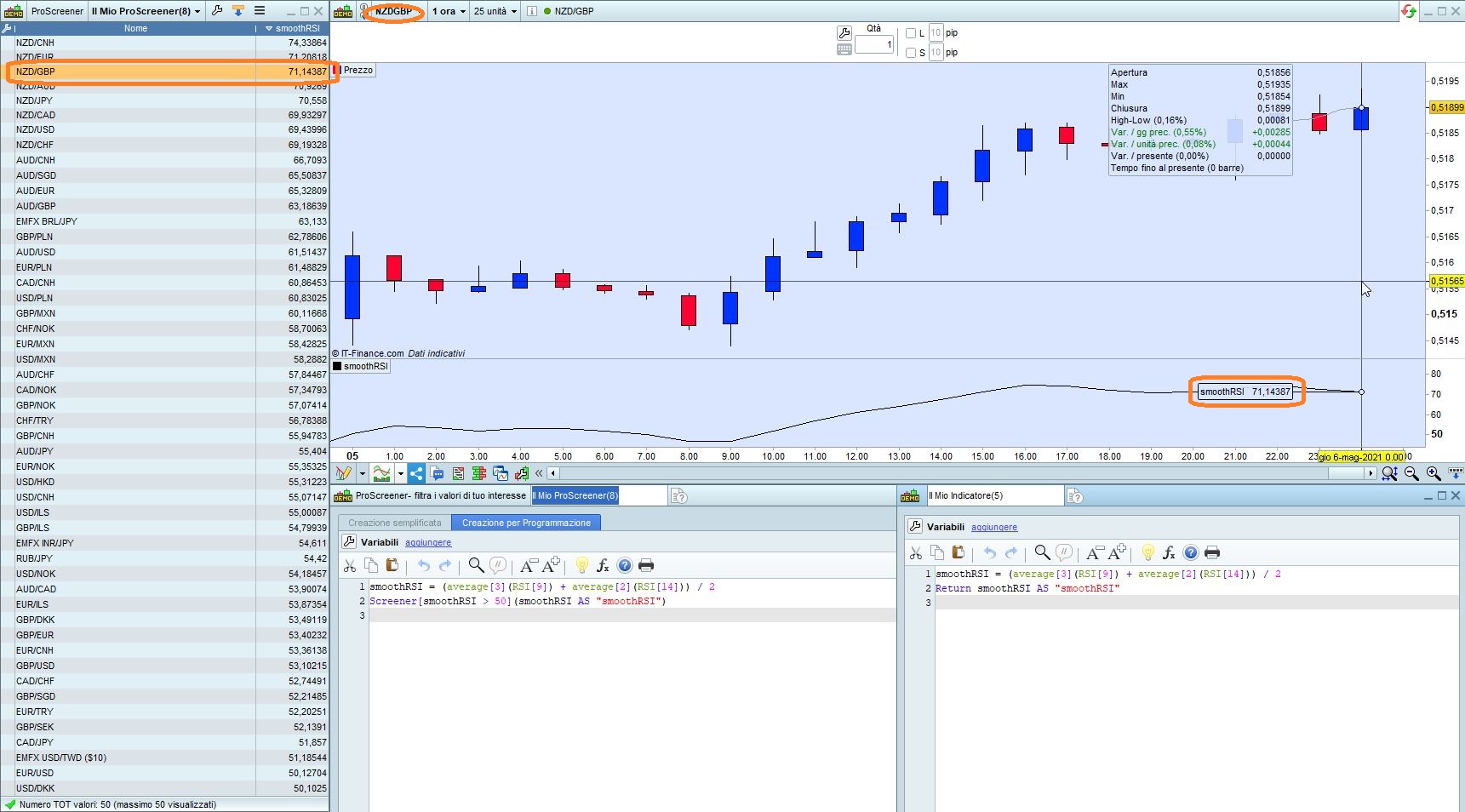 As to smoothRSI, it works fine (see pic), both as an indicator and a screener. Sometimes there can be some minor differences due to a different update timing.
