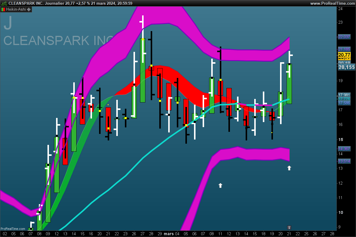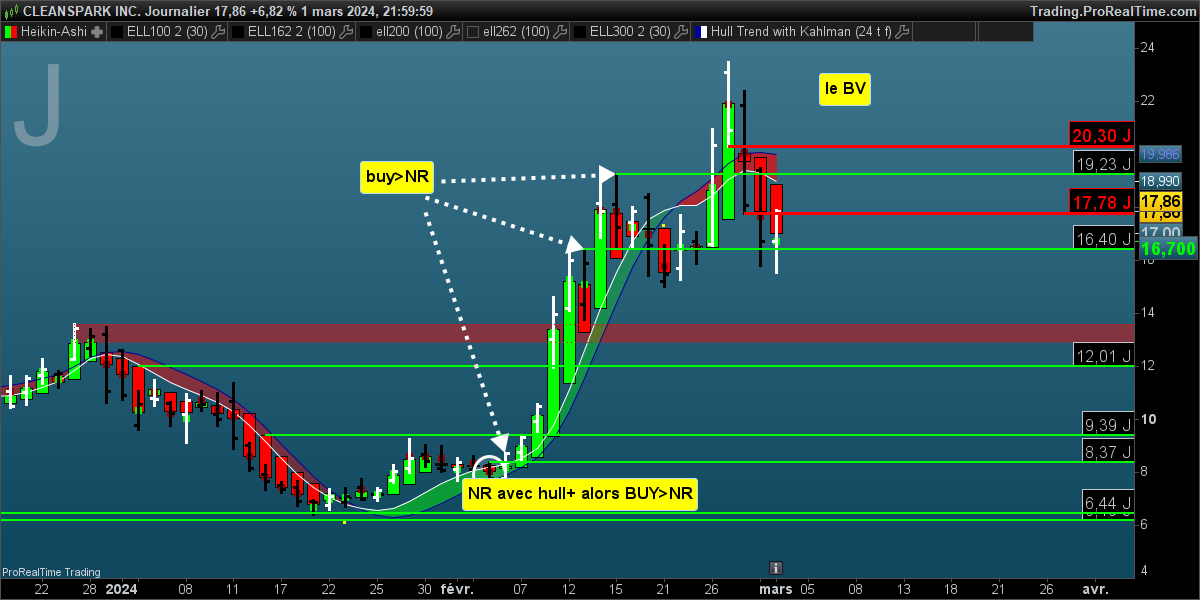 Bonjour, j’aimerais parametrer un scrreener qui détecte les configs suivantes: dernière bougie ( j’utilise un blanc/noir sur les graphes et en barchart pour mieux les detecter) et heikensashi de meme nature ( haussiere ou baissiere). donc blanc/vert ( BV) ou noir/rouge( NR) avec comme signal ( haussier) buy >du plus haut d’une NR si cours > bandeau de hull . quelques exemples suivent ( pour faciliter la vue , à nouveau j’ai placé un barchart ( blanc/noir au lieu de vert/rouge) à la place d’une bougie classique. Par la suite, le signal 5* sera: buy >noir/rouge NR si cours >hull et inversement sell< blanc/vert ( BV) si cours <bandeau de hull. D’autre signaux sur configs 2 bougies tels que; blanc/rouge ( BR) apres une noir/rouge ( NR) alors sell<NR si hull negatif. si hull positif, une NR aprés un BR alors buy>NR. J’ai identifié plusieurs configs qui donnent régulièrement des points avec un stoploss proche. Les stoploss sont placés sous le plus bas d’une NR si signal BUY ou au dessus d’une BV si signal SELL