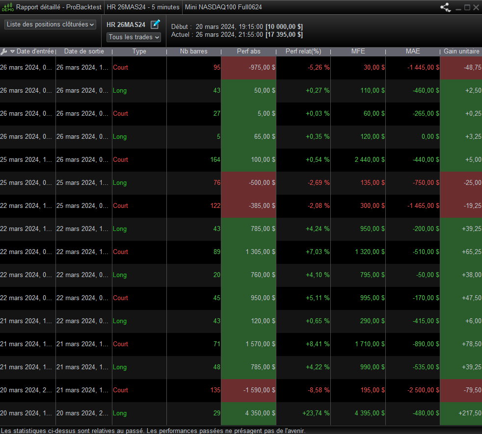 Je cherche à créer un robot pour prendre les ordres auto sur le NQ YM CL. Time frame 2mn et prendre que 4 pts sur NQ 10 pts sur YM et 10 points sur CL. est ec que tu sais le programmer? Pour lemoment uniquemnt avec les signaux Buy > NR et SELL<BV. mais j’ai listé 15 autres onfigurations de 2 bougies ui générent également de bons siganux en scalping.