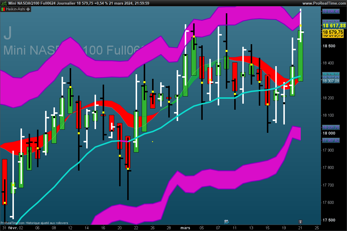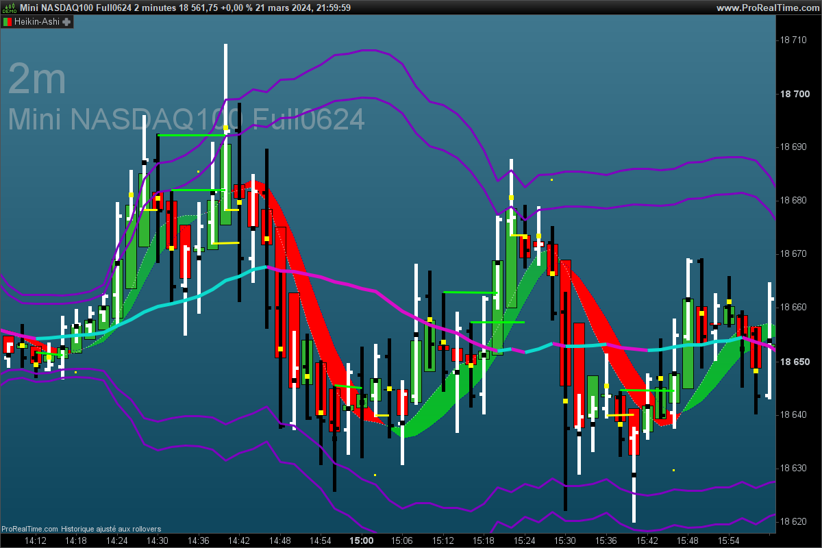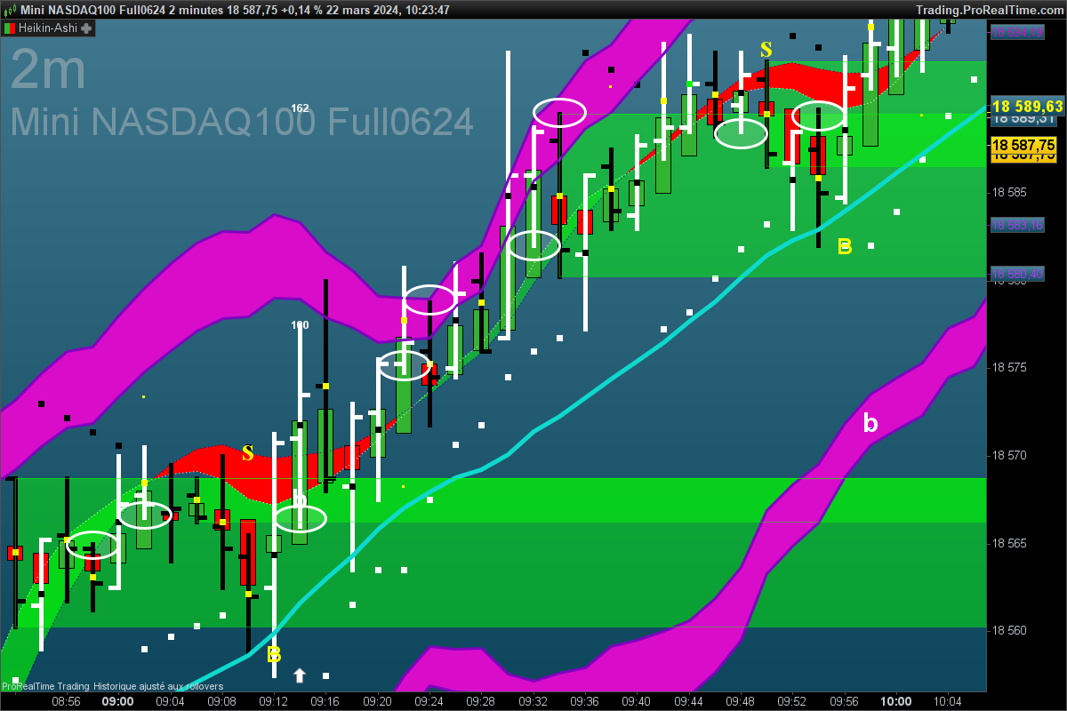 Sur le NQ en 2m ce 21 mars, j’ai identifié 15 signaux en 1h20 qui donnent en moins de 2 bougies au moins 6 pts donc 90 points . Le 2mn semble bien adapté
