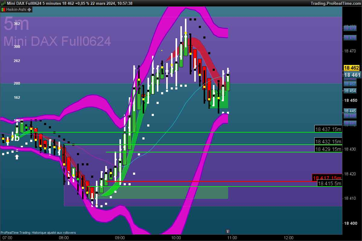 ce matin sur le Dax 15mn, un faux signal , on met un stop juste au dessus de 50% de la bougie signal. puis 3 signaux BUY pour un target maxi de 50pts environ.