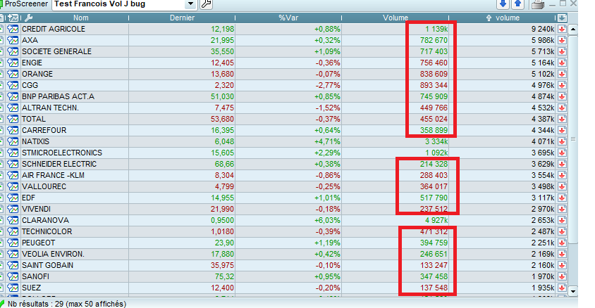 je devrais récupérer tous les titres dont les volumes sont supérieurs à 1200000 … et pourtant ce n’est pas le cas. le screener me récupère trop de valeurs car il se base sur les volumes de vendredi et non du jour …