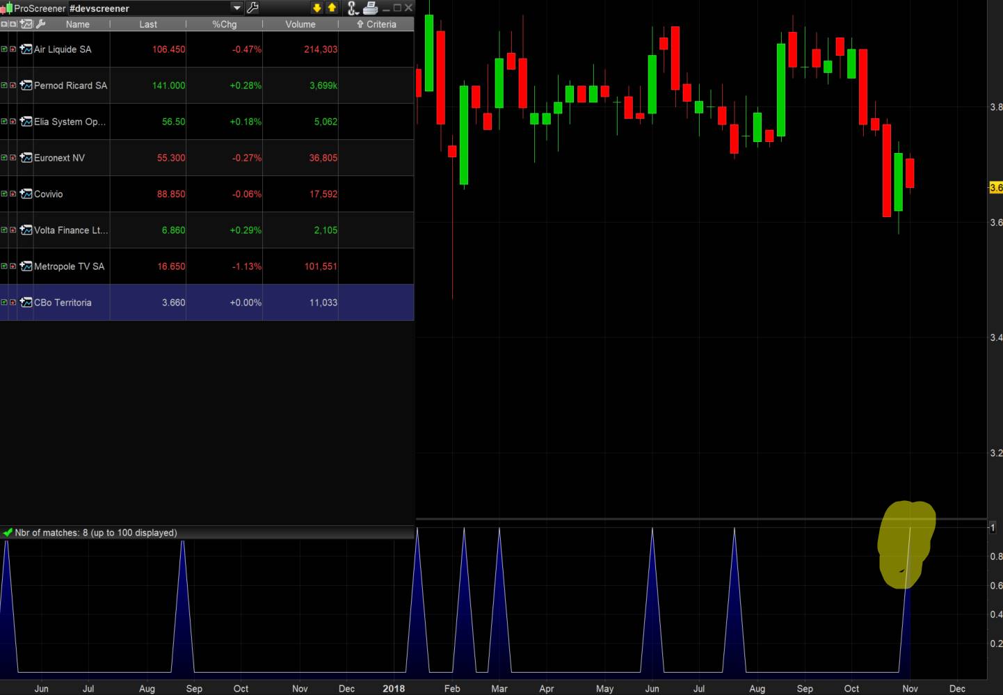 Ce jour, toutes les valeurs remontées sur EURONEXT correspondent bien au signal donné par tes conditions, ici transformées en indicateur: