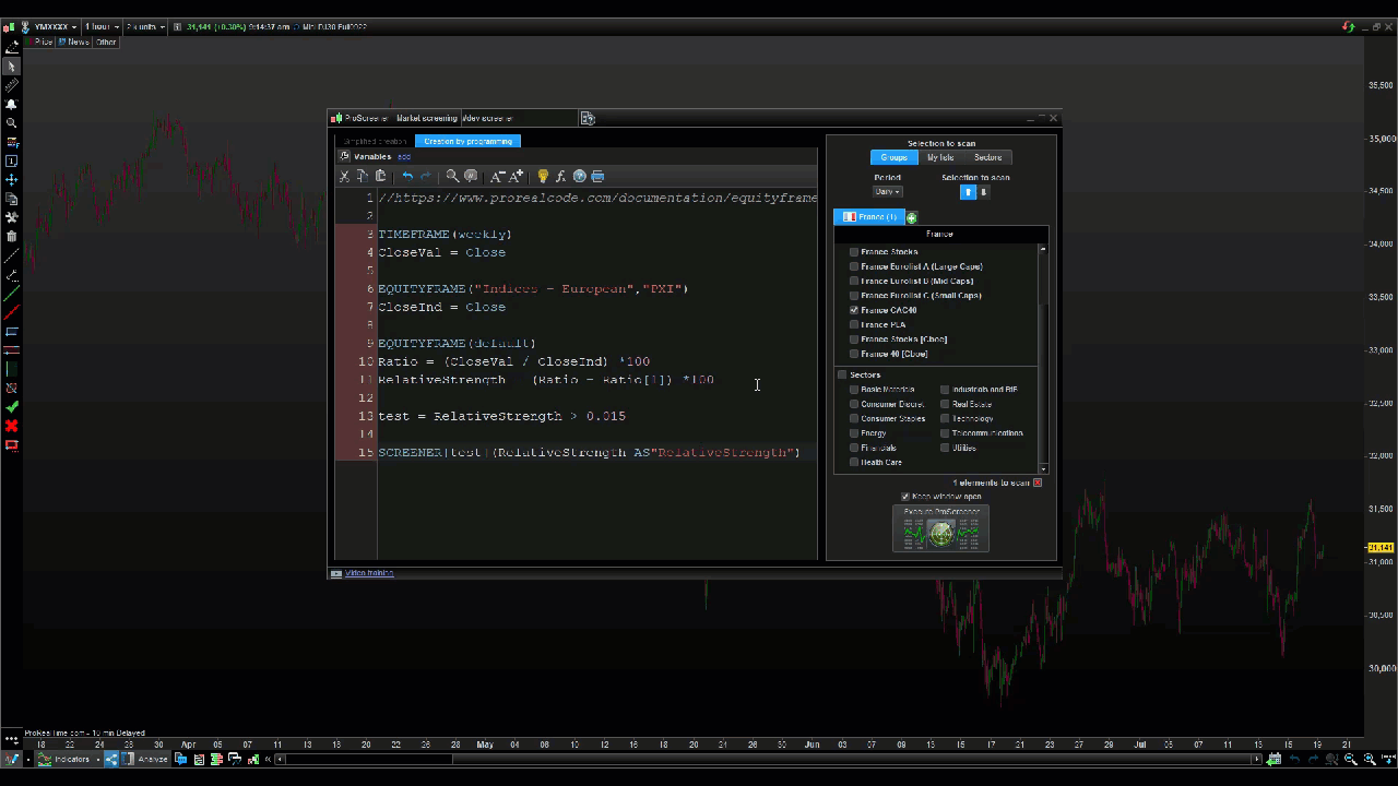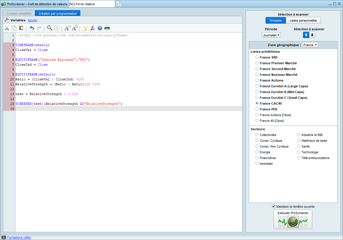 Je confirme que le code posté ci-dessus fonctionne correctement, au lancement du screener, il faudra bien choisir l’instrument en relation avec celui écrit dans l’instruction EQUITYFRAME (ou un autre à convenance). Une fenêtre de recherche dans les listes, s’ouvre automatiquement pour sélectionner l’instrument comparé.