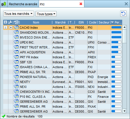 Je viens de retester, on a bien une fenêtre qui s’ouvre pour aider à choisir la valeur à comparer, ici je choisis le CAC40 index (PXI), mais on pourrait cliquer sur n’importe quelle autre valeur.