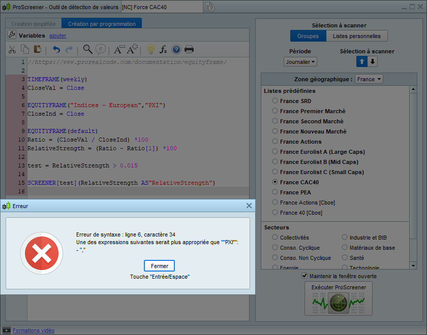 J’ai bien lu le fil du topic mais je rencontre un problème lors de l’exécution du screener que Nicolas propose (voir photo). Je suis en donné journalière. Cela a t il une incidence?