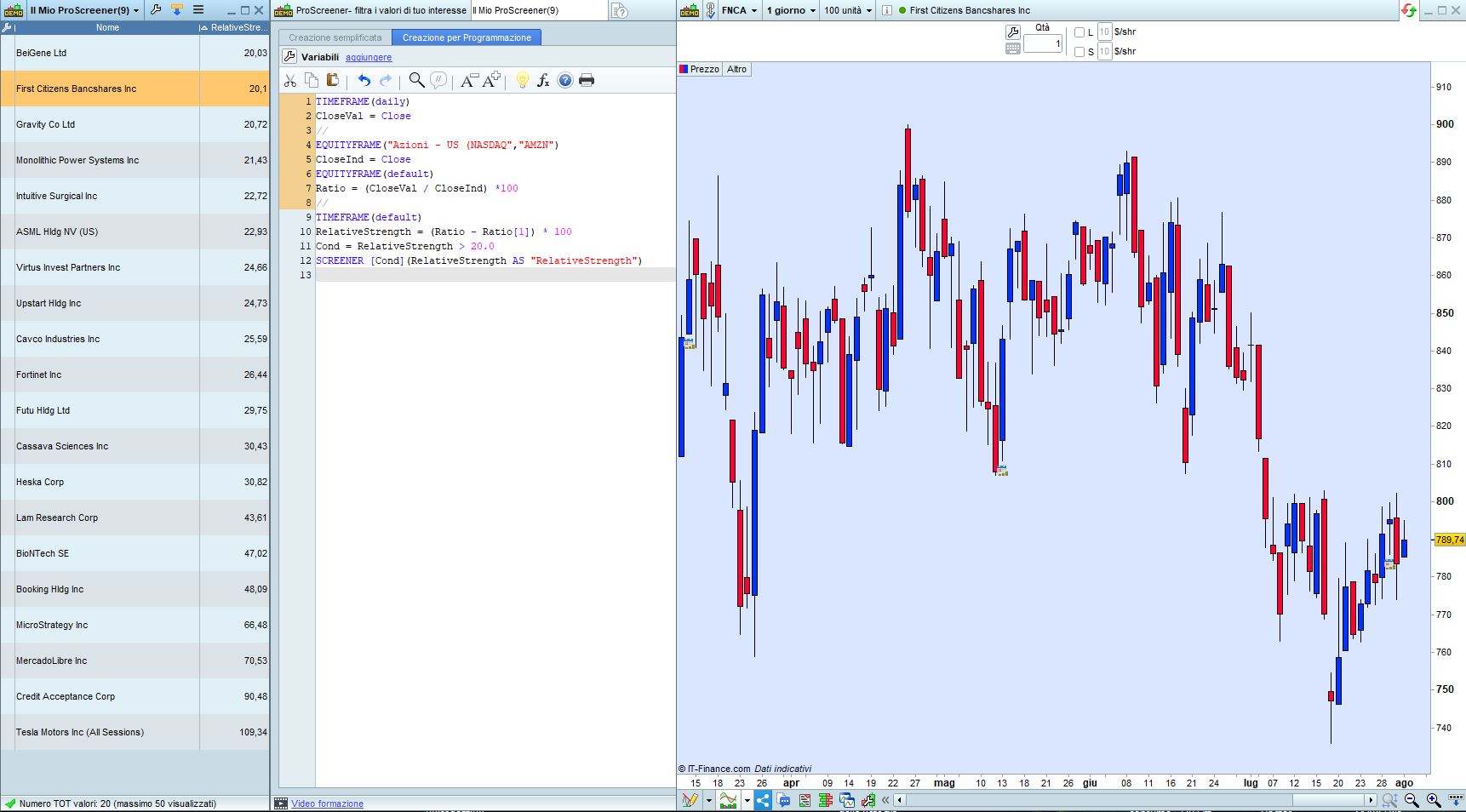 è possibile creare uno screener che ritrovi i titoli con maggiore forza relativa rispetto al proprio indice di appartenenza in modo da stilare una lista dei titoli più forti?