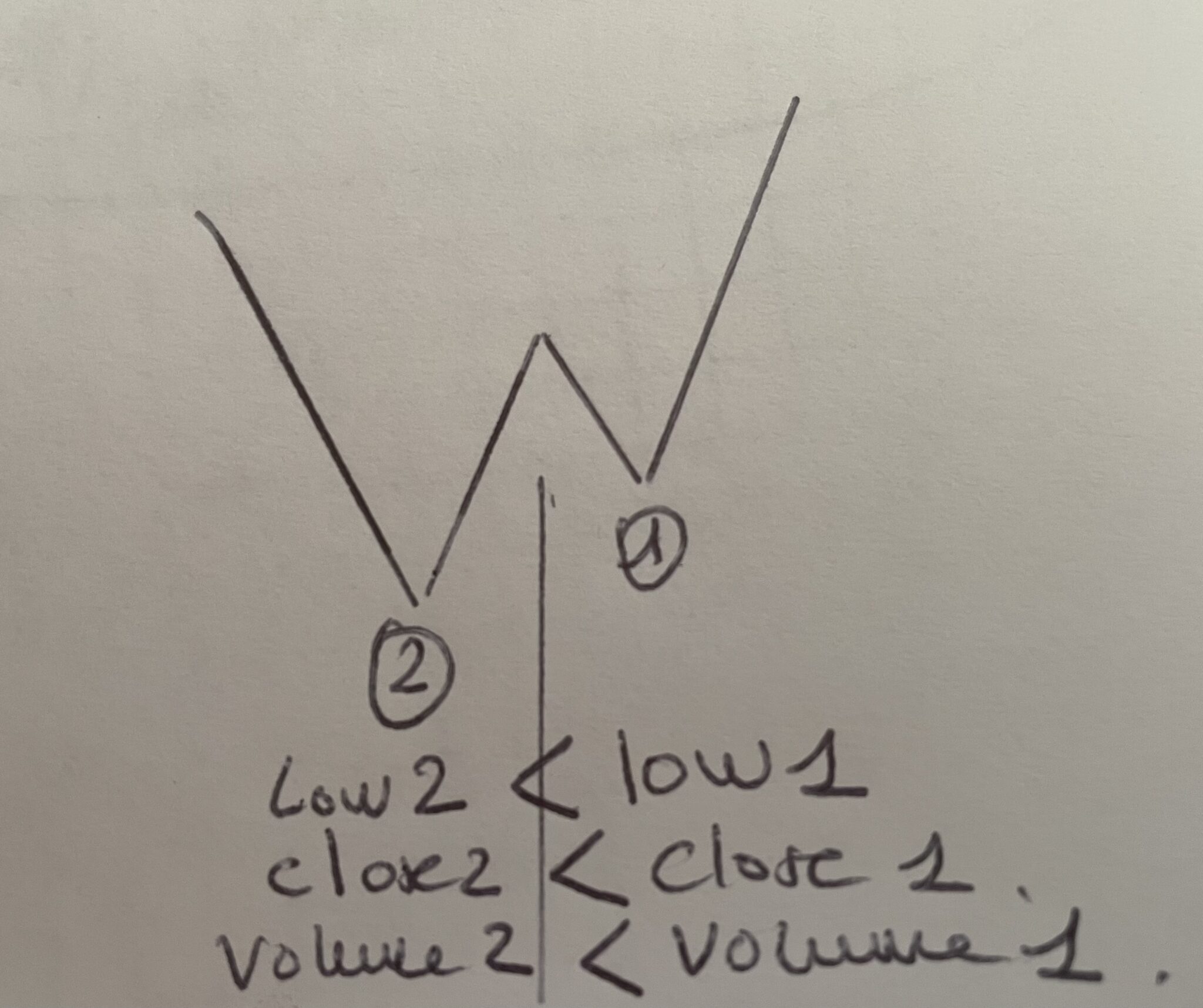 – Le volume du chandelier le plus bas du creux le plus récent (1) doit être supérieur au volume du plus bas du creux précédent (2).