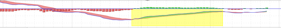 - Sort d’une LONGUE tendance baissière (donc MACD en-dessous de sa ligne de signal depuis X bougies)