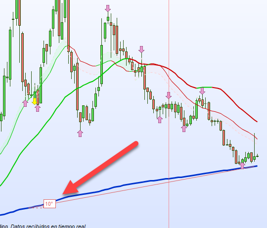 No hay forma de medir un ángulo en una pantalla, porque todos son diferentes, y eso es solo visual. Así que tenemos que normalizar el precio durante un período específico y usar trigonometría: en este código estoy usando la medida de la pendiente de la media móvil de 200 períodos durante los últimos 10 períodos.