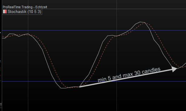 wie kann man in einem screener anweisen, das die vorletzte! Kreuzung des stoch %K über den stoch %D mindestens 5 und maximal 30 Balken her sein soll.