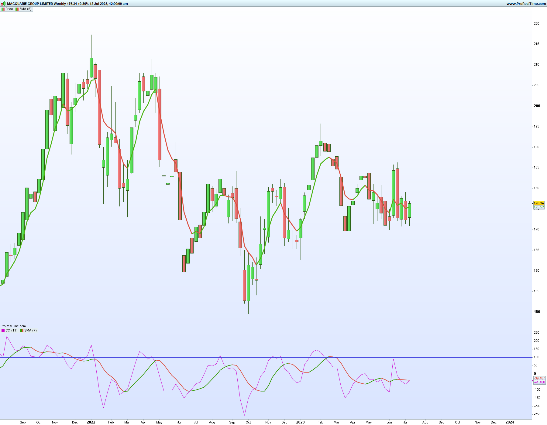I have attached a screenshot of the Macquarie weekly chart as it screened. You can see that the ema(5) is green which means it is increasing in price. The price is also above the ema(5) which should have screened this share out of the results. Either of these conditions should have removed it from the screener’s results. I have shut down the computer and restarted it and also restarted prorealtime as well in case the registers in the background were holding the wrong data.