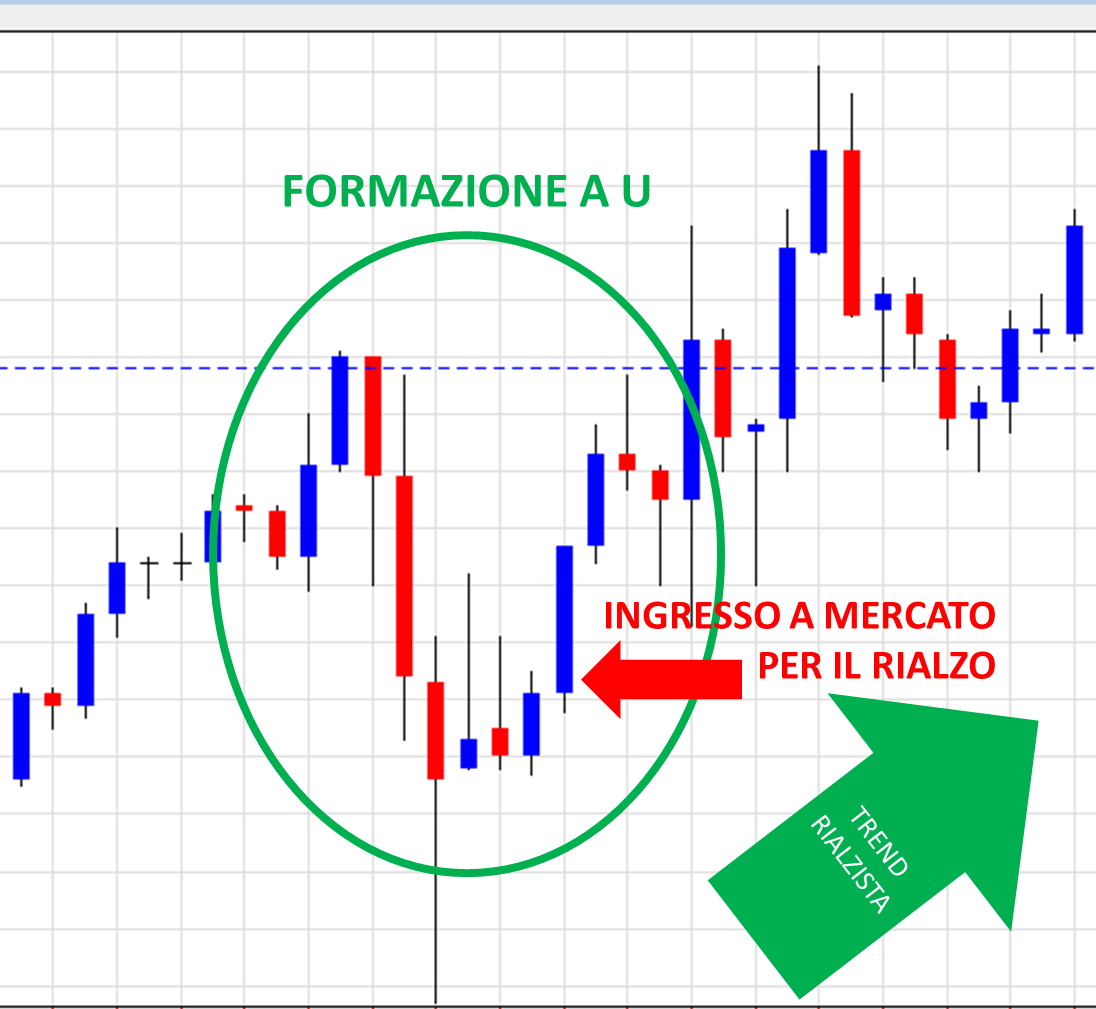 En clair, les configurations en « U » suivent toujours le sens de la tendance. Donc si la tendance de fond est haussière, les configurations en « U » seront jouées à l’achat et inversement lorsque la tendance de fond est baissière.