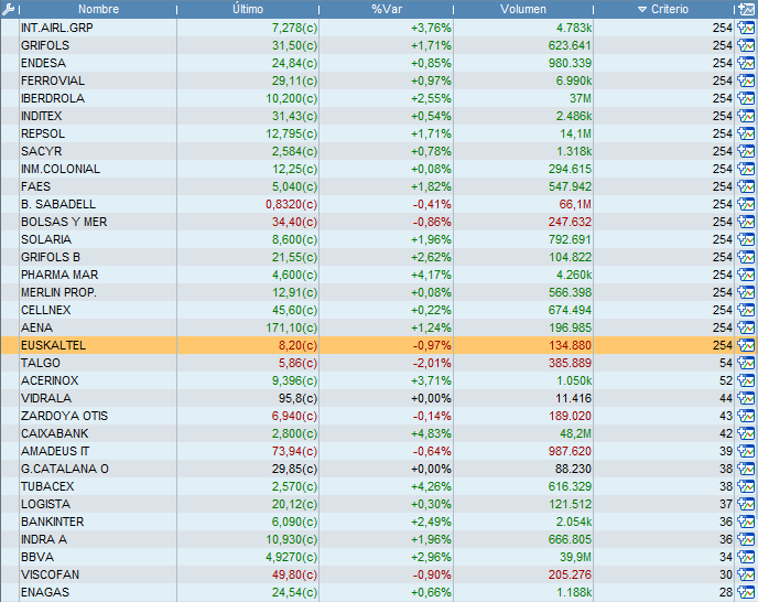 Gracias Nicolás, sin embargo, no sé si le falta algo o es un BUG de Prorealtime, si lo pasas sobre la lista de acciones España aparece esto (adjunto imagen)