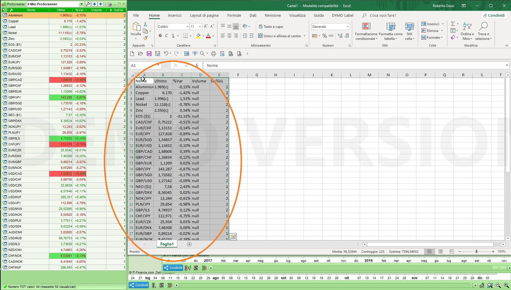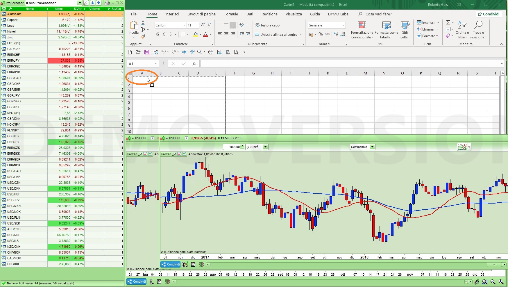 - posiziona il mouse sulla prima colonna e riga dello screener e tieni premuto il pulsante sinistro