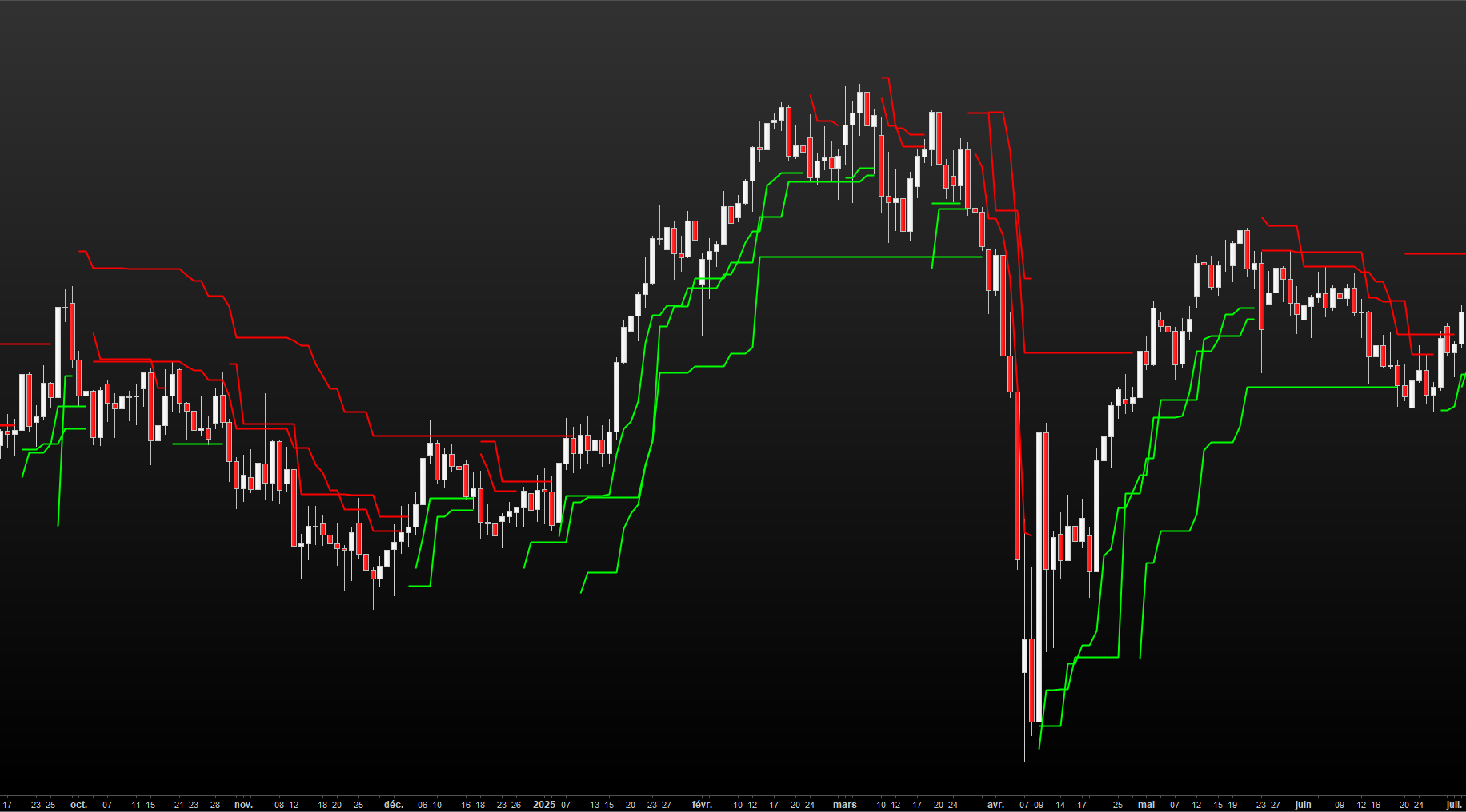 Je souhaiterais de plus, pouvoir identifier lorsque l’on passe d’une situation haussière à une situation baissière(image ci-jointe) sur l’indicateur “Super Trend AI Clustering”, pour pouvoir l’incorporer dans une approche Multi TimeFrame et je ne m’en sors pas avec NewOs ou Newupper ou Newlower !!!