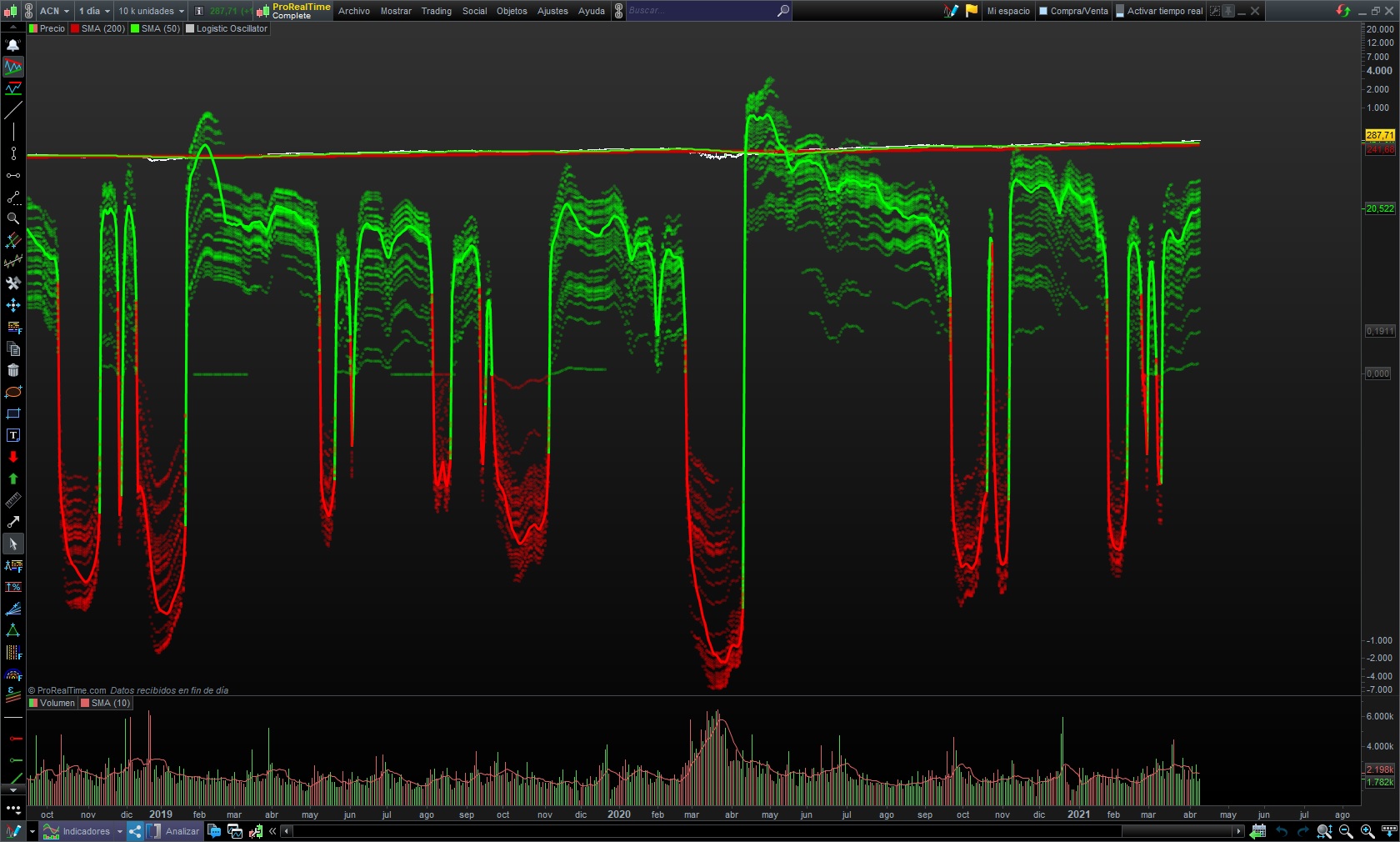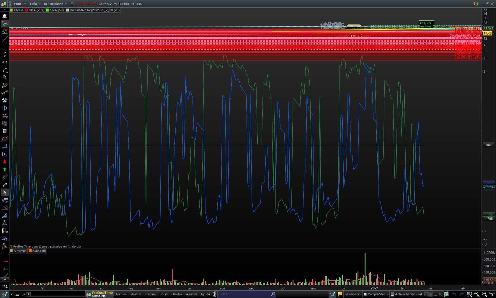 Las lineas trazadas que se mueven son en grafico anual, mensual o semanal que son los que utilizo yo, se mueven todas hacia arriva y cuanto mas tiempo hace que no abro el grafico (tambien abierto) distancia se desplazan del punto original, esto me pasa desde hace 2 años, he llamado a prorealtime y he enviado desde la plataforma emails y no me dan solucion y la verdad es muy molesto porque luego tengo que o borrar todas las lineas o volver a colocar. En cuanto al codigo es un codigo de un indicador tipo volumen (perdon dije screener en el anterior mensaje), pero es muy raro porque en su momento funciono pero ahora en vez de abrirlo en una ventana como el indicador de volumen lo abre en el precio. Cuando lo abri al principio, en 2018, en algun grafico y se quedo en él guardado, ahora sigue funcionando correctamente. Gracias por ayudarme, toda ayuda sera bienvenida.