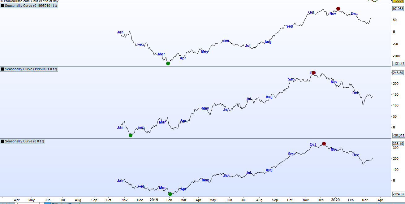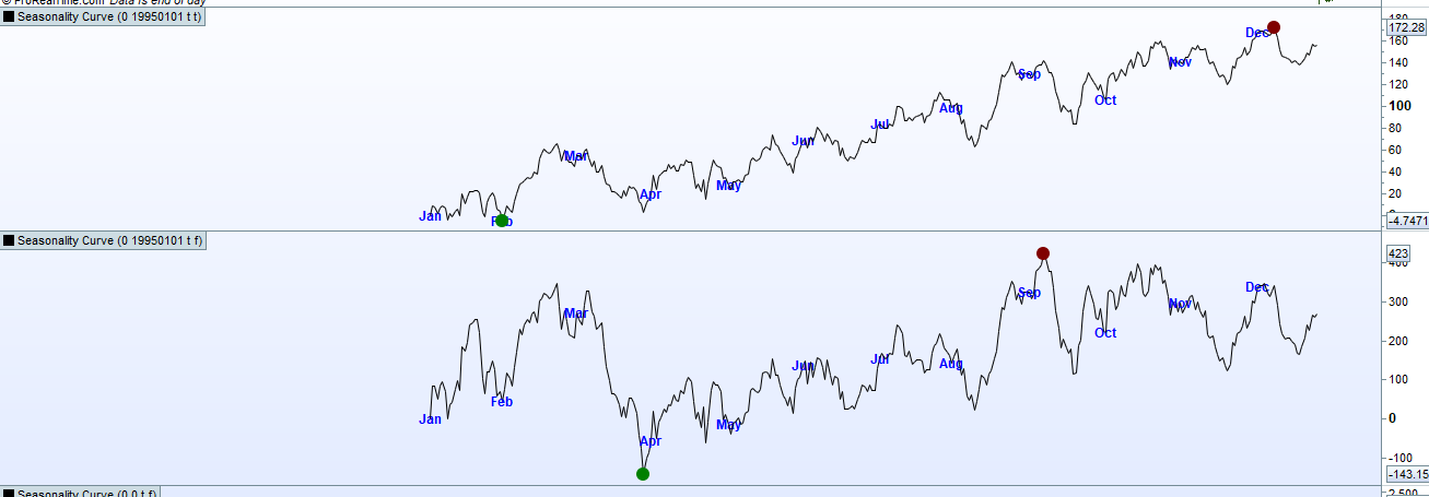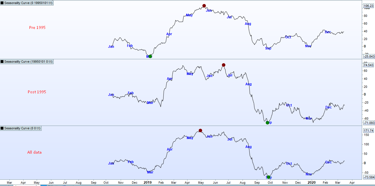 There is a danger when using seasonality to analyse the whole of history and believe that is what it does every month of every year but by breaking it into two or more sample periods we can see that the markets have changed a lot. Computers started to be used for analysis and trading around the 90’s and I would guess that this has a lot to do with the differences as well as the fact that farming and transportation to other parts of the world has become much more efficient and so I guess wheat is now a lot less seasonal.