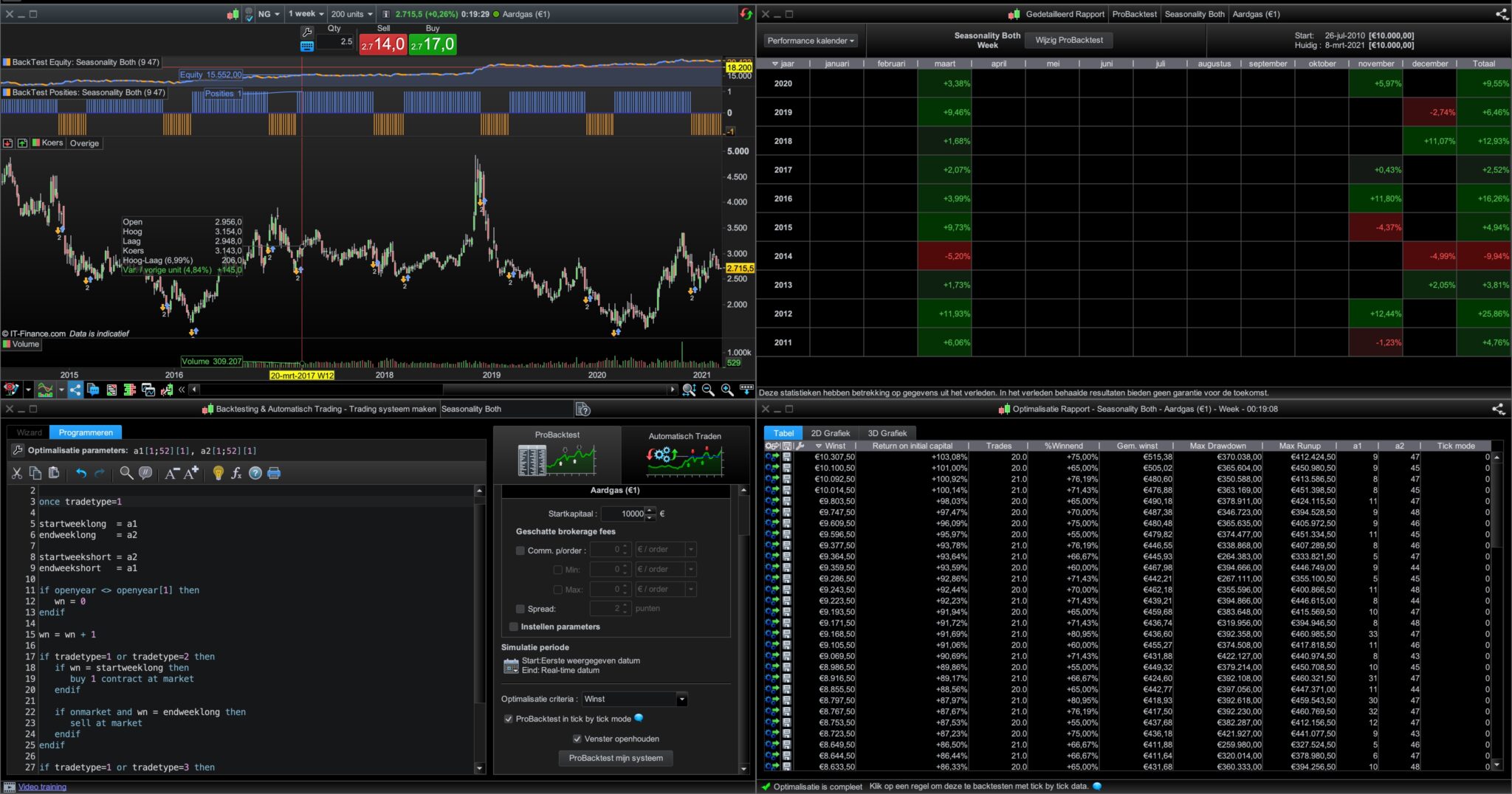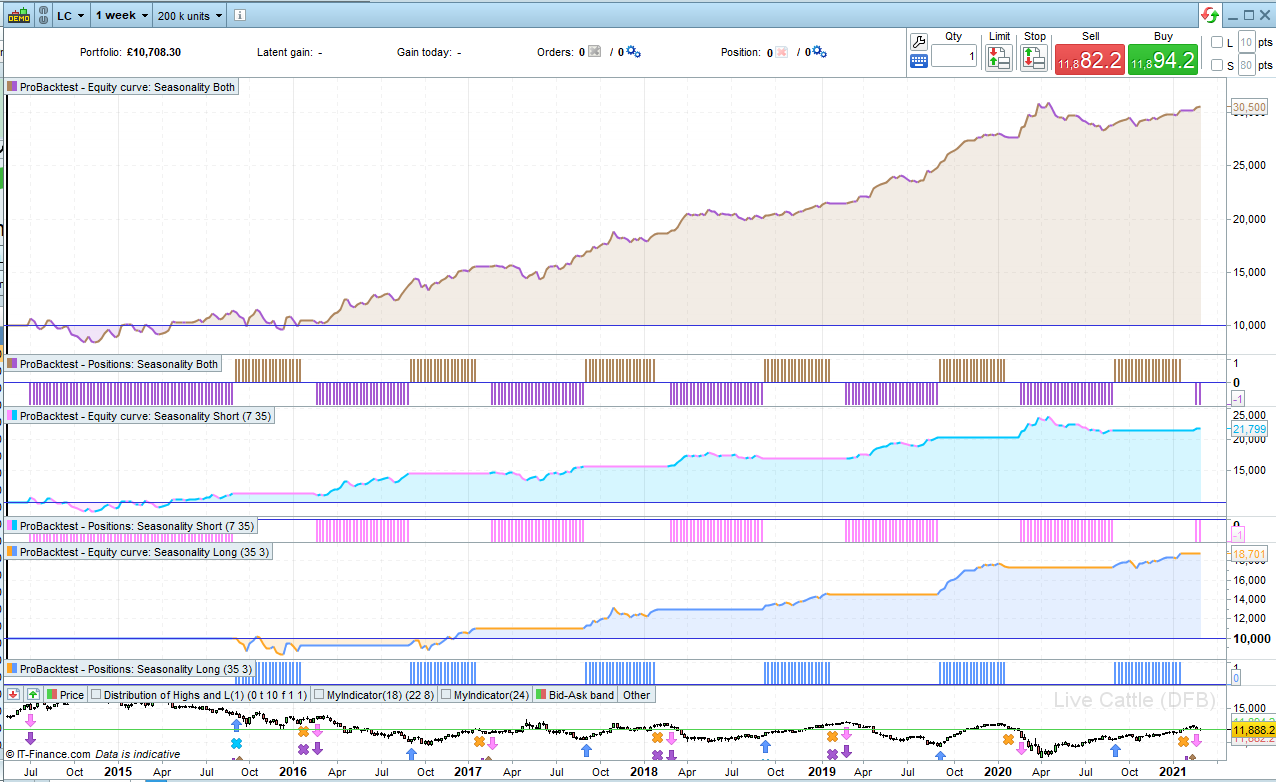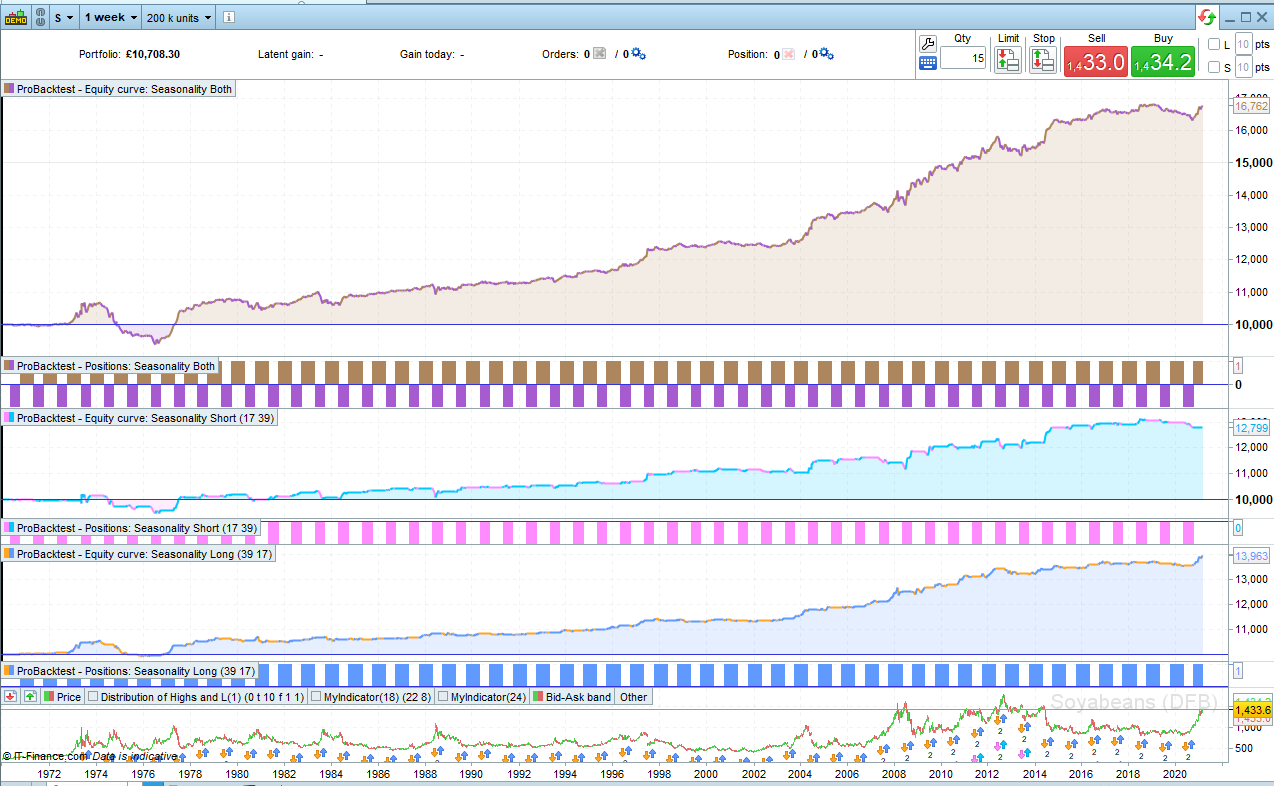 Then I created a third strategy that you can enter the best returned values as startweeklong, endweeklong, startweekshort and endweekshort so as to see what the equity curve would have looked like had you been short during the best weeks and long during the best weeks. On my tests I found that the best long weeks rarely clashed with the best short weeks but if you find an instrument where they do then you can’t put those values in the ‘Both’ strategy.
