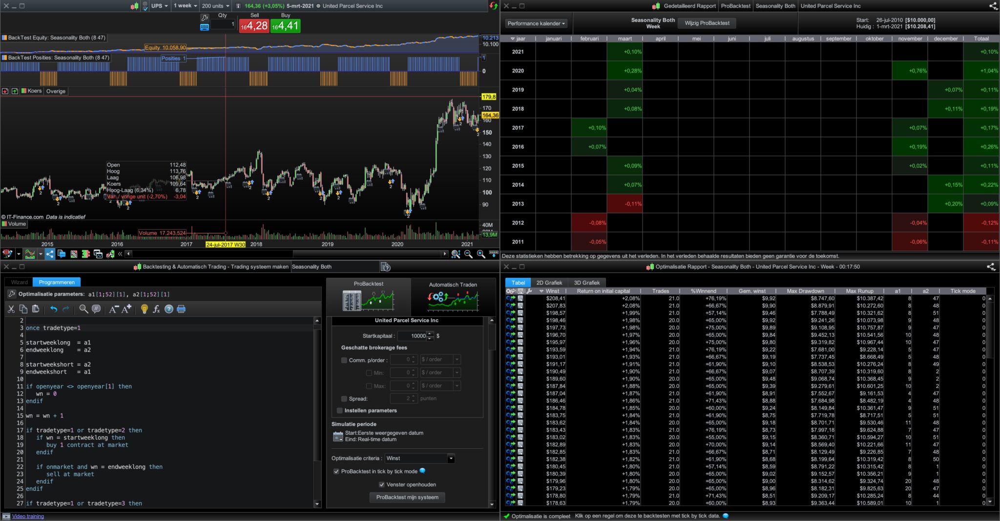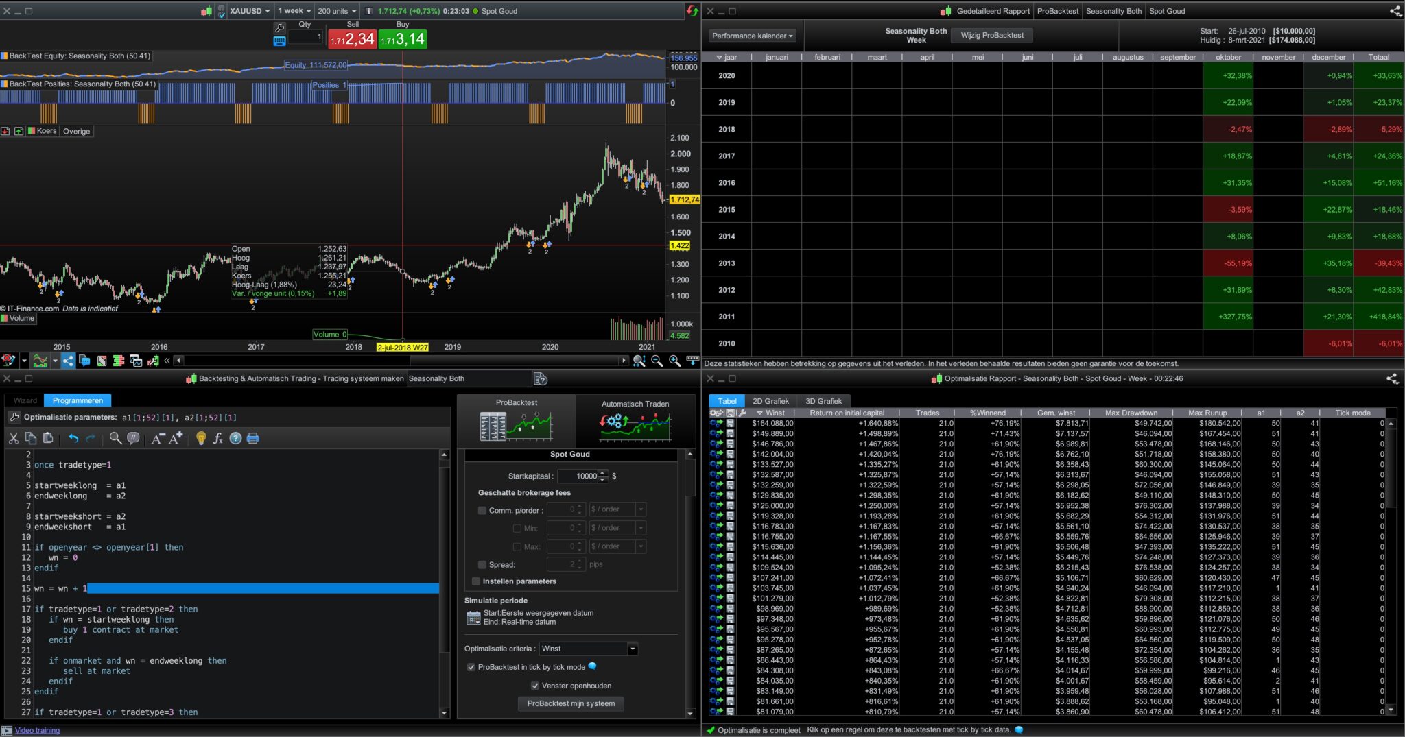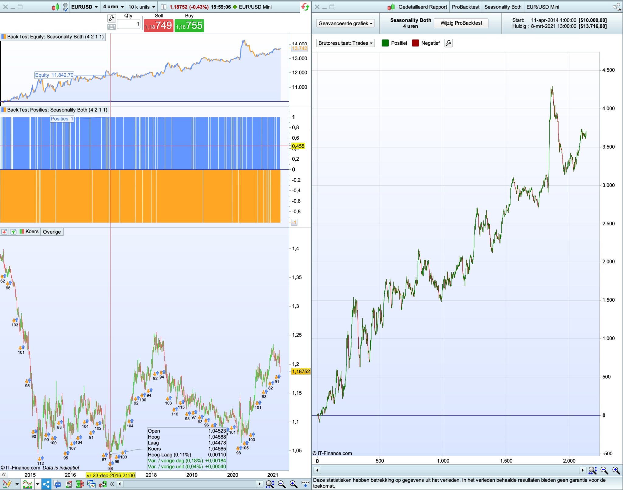 Then I created a third strategy that you can enter the best returned values as startweeklong, endweeklong, startweekshort and endweekshort so as to see what the equity curve would have looked like had you been short during the best weeks and long during the best weeks. On my tests I found that the best long weeks rarely clashed with the best short weeks but if you find an instrument where they do then you can’t put those values in the ‘Both’ strategy.