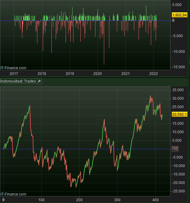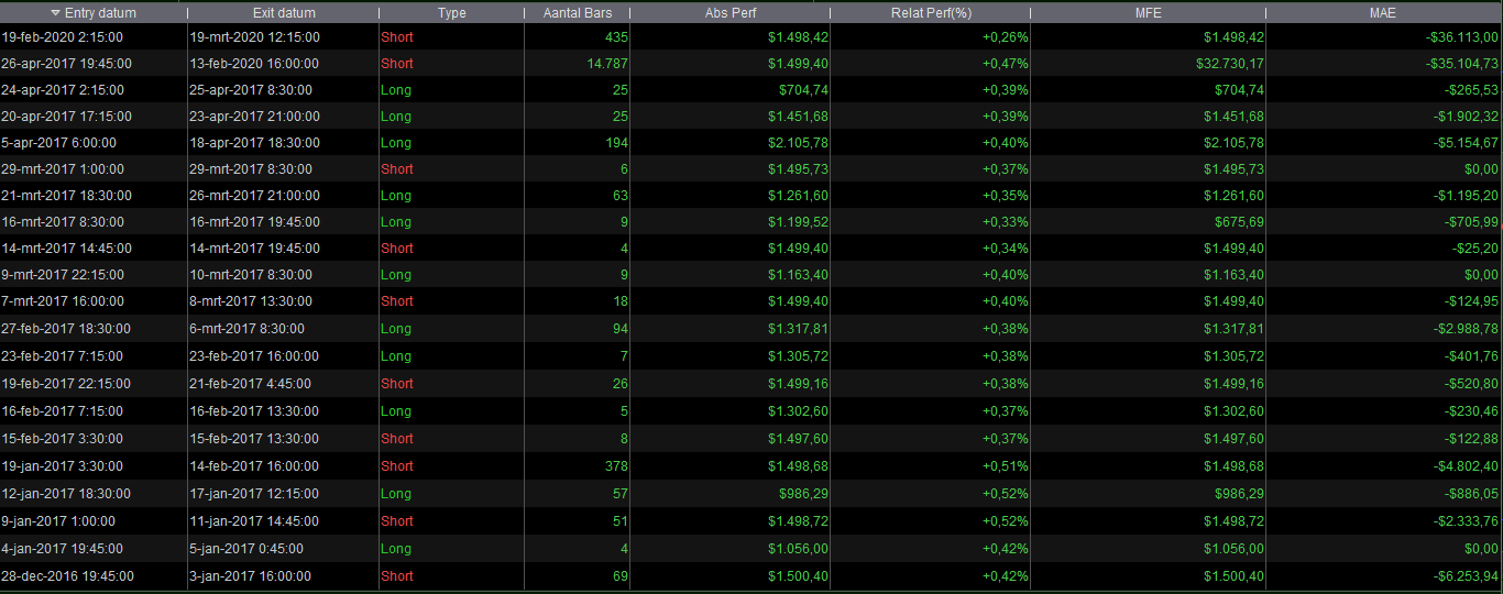 People can also try to wrap their head around the fact that almost all Limit-exits are followed by a Buy (SellShort) again in the same bar. With the Stop this hardly happens (if you look at mentioned overshoot you can already see it won’t do that). This is the ATR logic in the Strategy doing this, which is also why the Limit feels way more natural (to me ? because I use it all the time manually anyway ?).