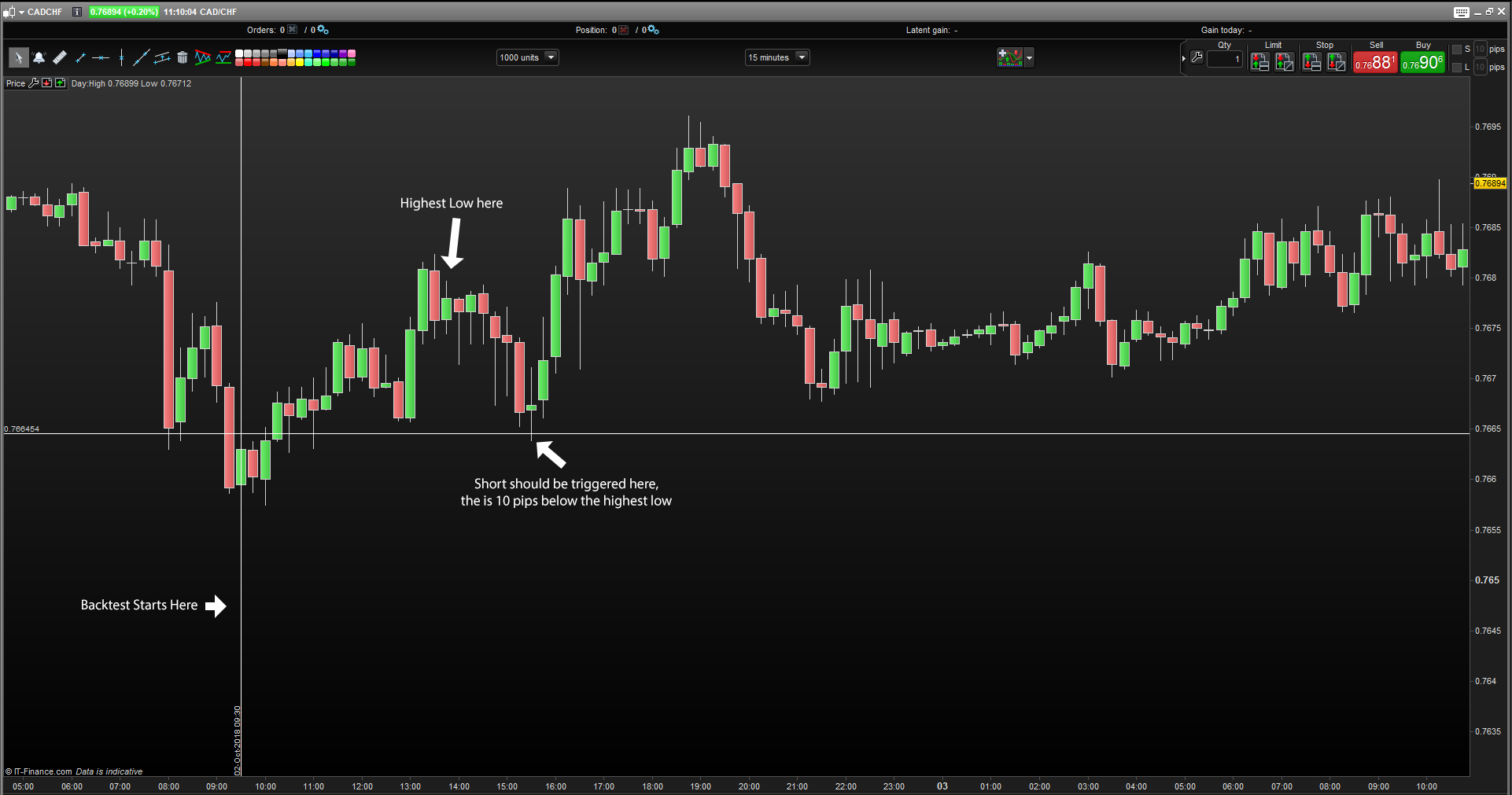 - The level of the Short is set to the value of the new higher low minus 10pips