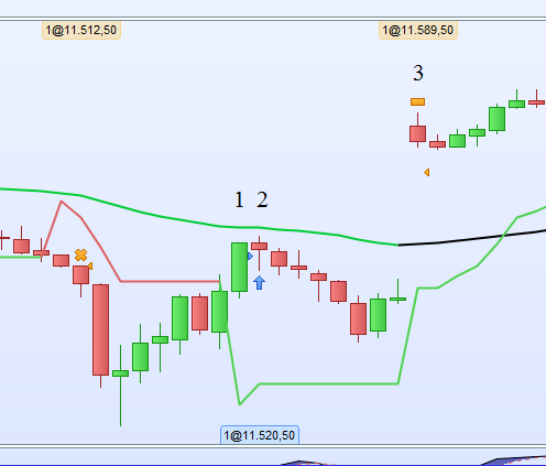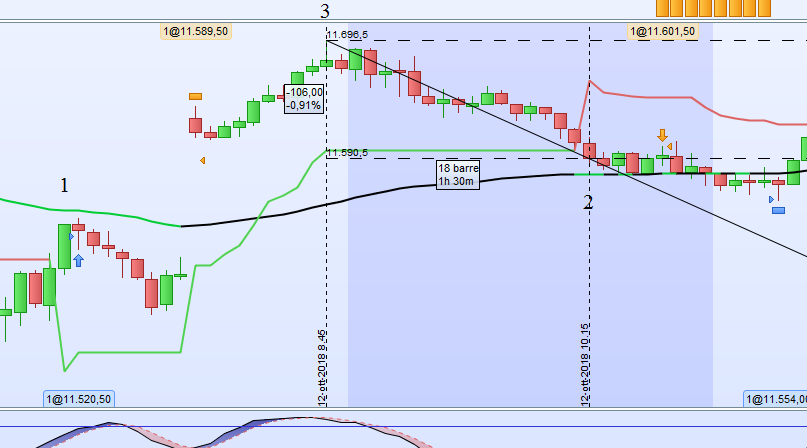 Allora, in candela 1 si ha il setup long (prezzo di chiusura = 11.531,50). L’ordine (pendente) viene eseguito in candela successiva con un RR di 11 punti (in questo caso) a 11.520,50. Ora, vediamo il rischio dell’operazione calcolato così come spiegato nel post precedente. Nella figura non è visibile però, il minimo precedente, era a 11.383. Quindi: