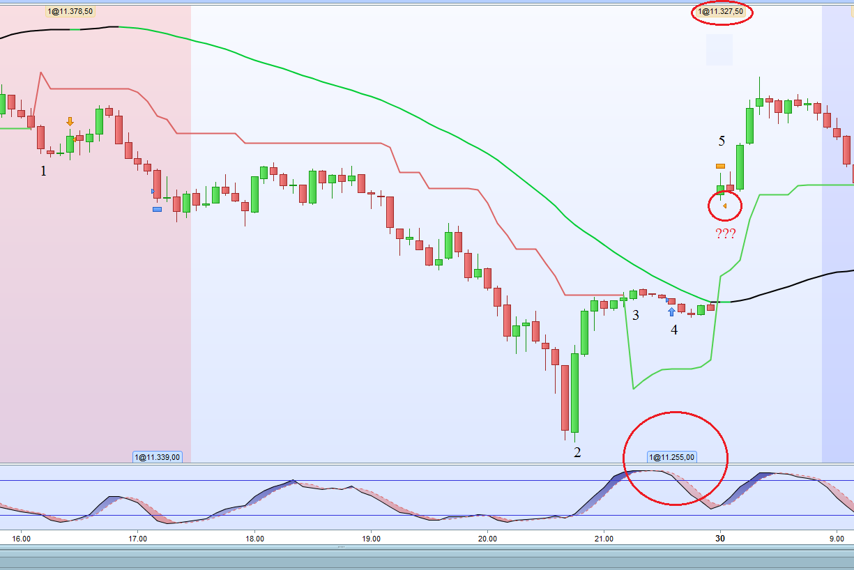 Ora, la candela in cui si verifica l’eseguito di vendita, è quella delle ore 8:00 del 30/10/2018. Candela che mostra un’apertura del future in gap up con un minimo a 11.332,00 ed un’apertura a 11.336,00.
