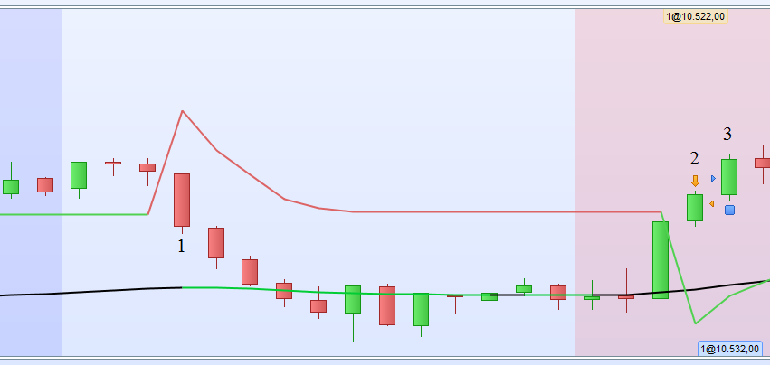 Poi accade una cosa “strana”. Dal momento che l’ordine di stop loss viene eseguito all’interno della medesima candela 2, il sistema PRT non ha modo di porre le variabili Rialzo e Ribasso a zero. Ciò in quanto, al termine della stessa candela, il sistema “non” è a mercato.